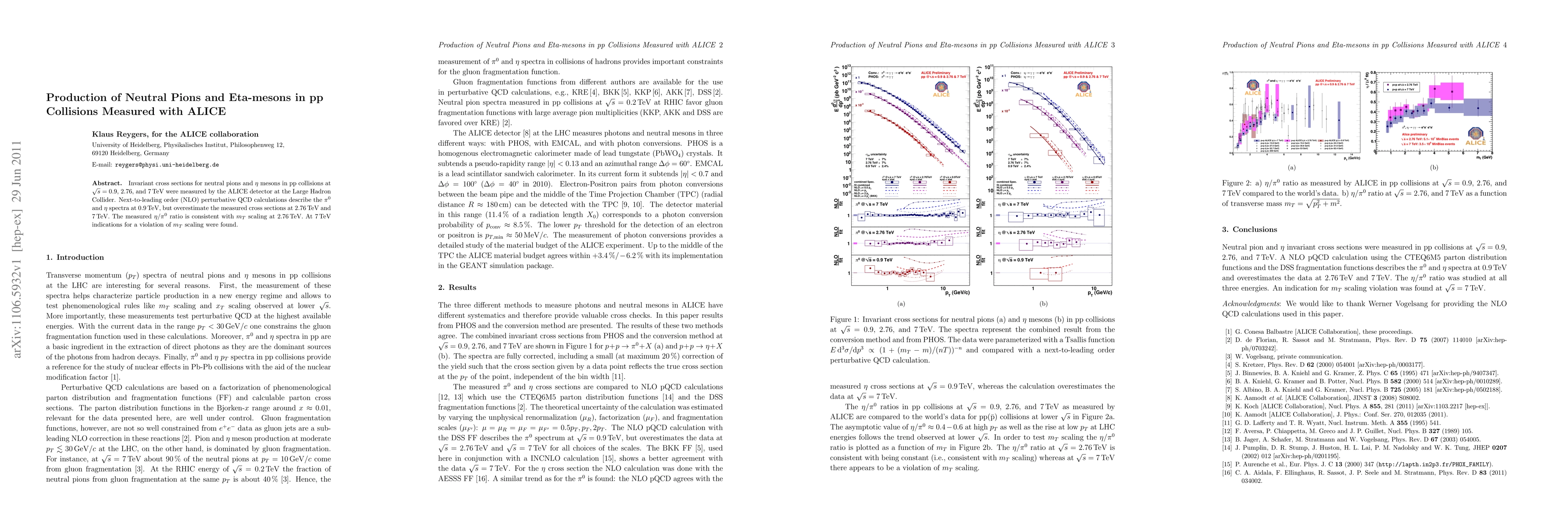 Invariant cross sections for neutral pions and eta mesons in pp collisions at sqrt(s) = 0.9, 2.76, and 7 TeV were measured by the ALICE detector at the Large Hadron Collider. Next-to-leading order (NLO) perturbative QCD calculations describe the pi0 and eta spectra at 0.9 TeV, but overestimate the measured cross sections at 2.76 TeV and 7 TeV. The measured eta/pi0 ratio is consistent with mT scaling at 2.76 TeV. At 7 TeV indications for a violation of mT scaling were found.