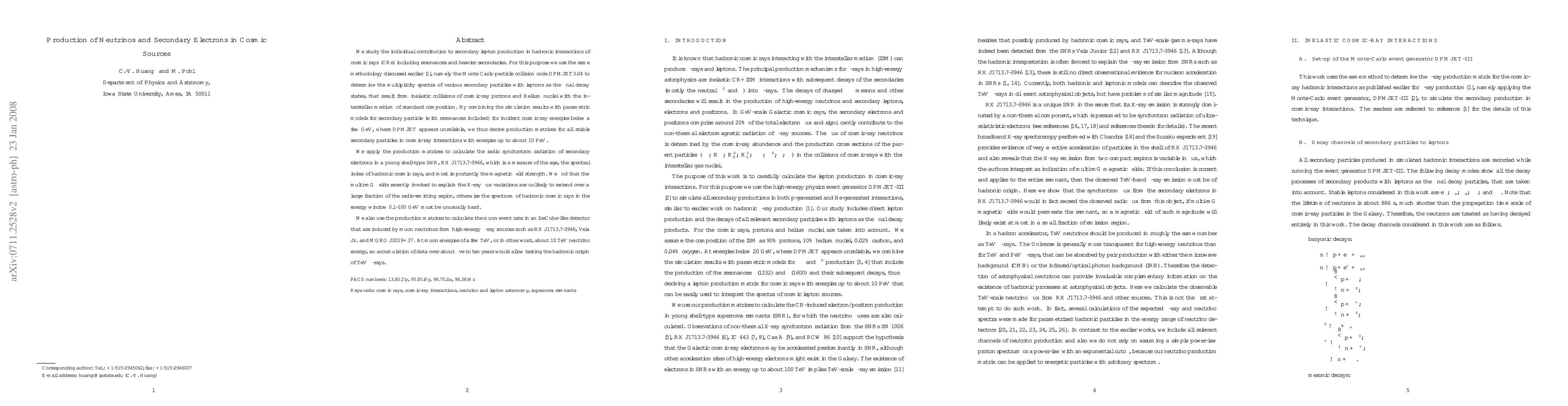 We study the individual contribution to secondary lepton production in hadronic interactions of cosmic rays (CRs) including resonances and heavier secondaries. For this purpose we use the same ethodology discussed earlier \cite{Huang07}, namely the Monte Carlo particle collision code DPMJET3.04 to determine the multiplicity spectra of various secondary particles with leptons as the final decay states, that result from inelastic collisions of cosmic-ray protons and Helium nuclei with the interstellar medium of standard composition. By combining the simulation results with parametric models for secondary particle (with resonances included) for incident cosmic-ray energies below a few GeV, where DPMJET appears unreliable, we thus derive production matrices for all stable secondary particles in cosmic-ray interactions with energies up to about 10 PeV. We apply the production matrices to calculate the radio synchrotron radiation of secondary electrons in a young shell-type SNR, RX J1713.7-3946, which is a measure of the age, the spectral index of hadronic cosmic rays, and most importantly the magnetic field strength. We find that the multi-mG fields recently invoked to explain the X-ray flux variations are unlikely to extend over a large fraction of the radio-emitting region, otherwise the spectrum of hadronic cosmic rays in the energy window 0.1-100 GeV must be unusually hard. We also use the production matrices to calculate the muon event rate in an IceCube-like detector that are induced by muon neutrinos from high-energy $\gamma$-ray sources such as RX J1713.7-3946, Vela Jr. and MGRO J2019+37. At muon energies of a few TeV, or in other word, about 10 TeV neutrino energy, an accumulation of data over about five to ten years would allow testing the hadronic origin of TeV $\gamma$-rays.