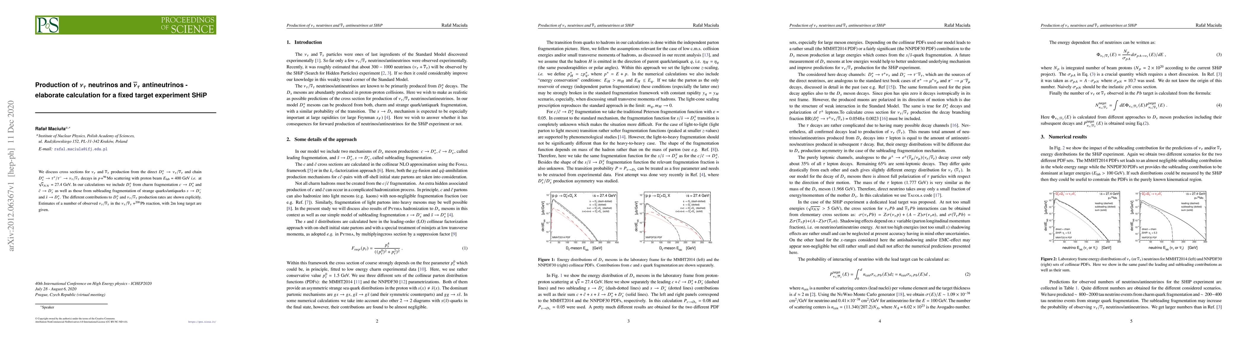 We discuss cross sections for $\nu_{\tau}$ and ${\overline \nu}_{\tau}$ production from the direct $D_s^{\pm} \to \nu_{\tau}/{\overline \nu}_{\tau}$ and chain $D_s^{\pm} \to \tau^+/\tau^- \to \nu_{\tau}/{\overline \nu}_{\tau}$ decays in $p\!+^{96}\!\mathrm{Mo}$ scattering with proton beam $E_{\mathrm{lab}}$ = 400 GeV \textit{i.e.} at $\sqrt{s}_{NN}$ = 27.4 GeV. In our calculations we include $D_s^{\pm}$ from charm fragmentation $c \to D_s^{+}$ and $\bar c \to D_s^-$ as well as those from subleading fragmentation of strange quarks/antiquarks $s \to D_s^-$ and $\bar s \to D_s^+$. The different contributions to $D_s^{\pm}$ and $\nu_{\tau} / {\overline \nu}_{\tau}$ production rates are shown explicitly. Estimates of a number of observed $\nu_{\tau} / \overline{\nu}_{\tau}$ in the $\nu_{\tau} / \overline{\nu}_{\tau} +^{208}\!\mathrm{Pb}$ reaction, with 2m long target are given.
