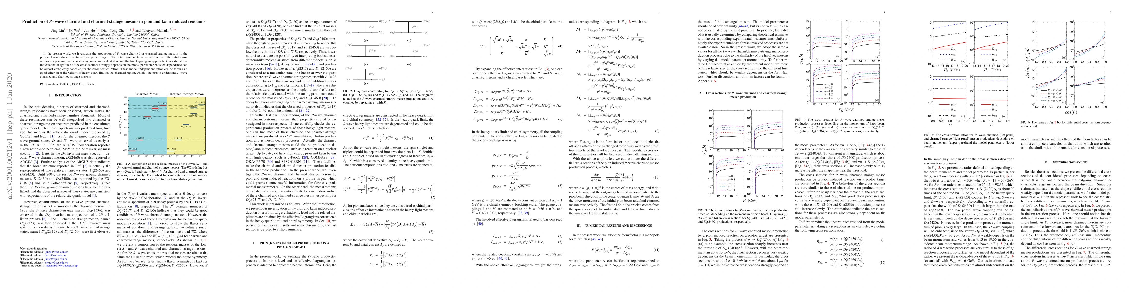 In the present work, we investigate the production of $P-$wave charmed or charmed-strange mesons in the pion or kaon induced reactions on a proton target. The total cross sections as well as the differential cross sections depending on the scattering angle are evaluated in an effective Lagrangian approach. Our estimations indicate that magnitude of the cross sections strongly depends on the model parameter but such dependence can be almost completely canceled for the cross section ratios. These model independent ratios can be taken as a good criterion of the validity of heavy quark limit in the charmed region, which is helpful to understand $P$-wave charmed and charmed-strange mesons.