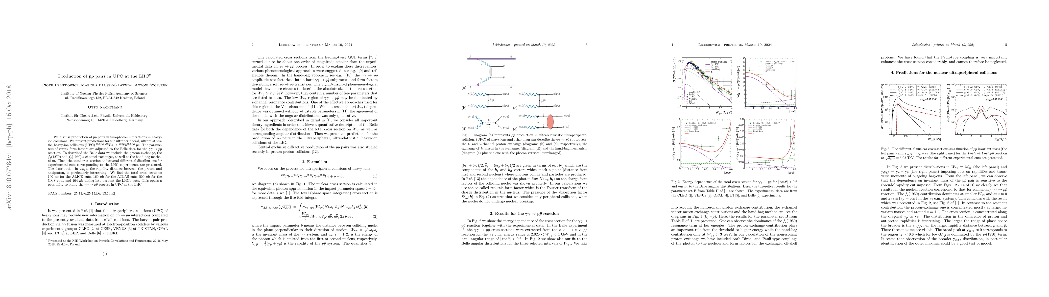 We discuss production of $p\bar{p}$ pairs in two-photon interactions in heavy-ion collisions. We present predictions for the ultraperipheral, ultrarelativistic, heavy-ion collisions (UPC) $^{208}\!Pb \, ^{208}\!Pb \to$ $^{208}\!Pb \, ^{208}\!Pb \,p \bar{p}$. The parameters of vertex form factors are adjusted to the Belle data for the $\gamma \gamma \to p \bar{p}$ reaction. To described the Belle data we include the proton-exchange, the $f_2(1270)$ and $f_2(1950)$ $s$-channel exchanges, as well as the hand-bag mechanism. Then, the total cross section and several differential distributions for experimental cuts corresponding to the LHC experiments are presented. The distribution in $\mathrm{y}_{diff}$, the rapidity distance between the proton and antiproton, is particularly interesting. We find the total cross sections: 100 $\mu$b for the ALICE cuts, 160 $\mu$b for the ATLAS cuts, 500 $\mu$b for the CMS cuts, and 104 $\mu$b taking into account the LHCb cuts. This opens a possibility to study the $\gamma \gamma \to p \bar{p}$ process in UPC at the LHC.
