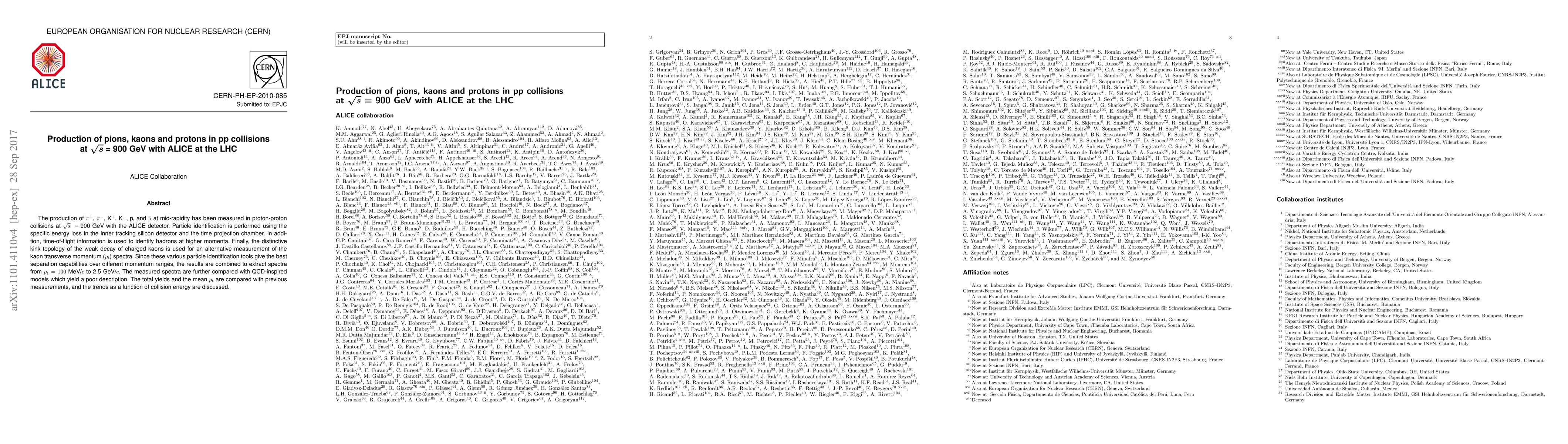 This study measures the production of pions, kaons, and protons in proton-proton collisions at $\sqrt{s} = 900$ GeV using the ALICE detector, employing various particle identification techniques. The results show discrepancies with QCD-inspired models, and comparisons with previous measurements reveal trends in total yields and mean transverse momentum.