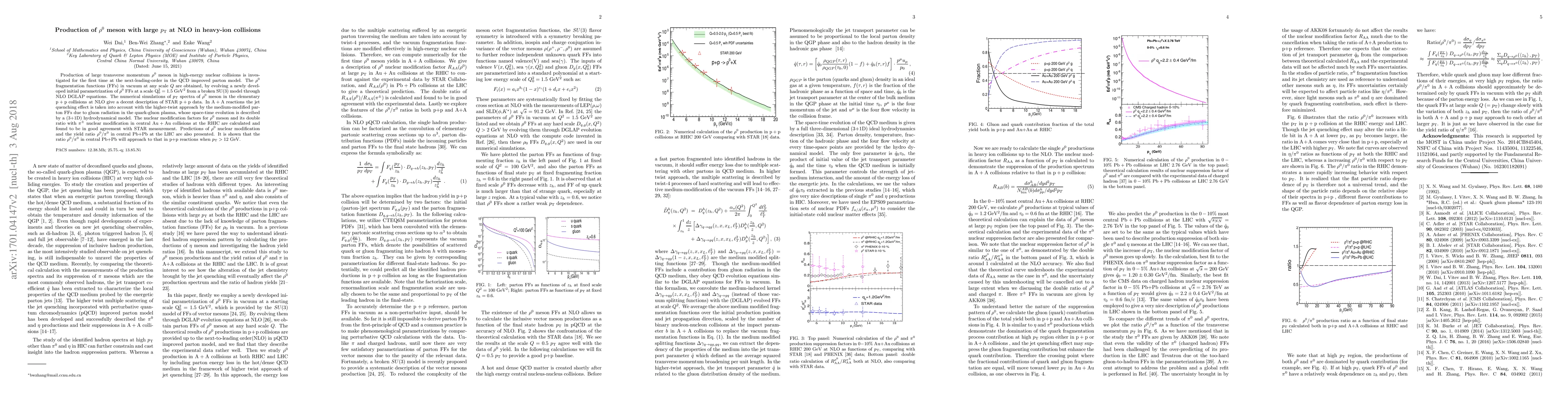 Production of large transverse momentum $\rho^{0}$ meson in high-energy nuclear collisions is investigated for the first time at the next-leading-order in the QCD improved parton model. The $\rho^0$ fragmentation functions (FFs) in vacuum at any scale $Q$ are obtained, by evolving a newly developed initial parametrization of $\rho^0$ FFs at a scale $\rm Q_{0}^2=1.5\ GeV^2$ from a broken SU(3) model through NLO DGLAP equations. The numerical simulations of $p_{\rm T}$ spectra of $\rho^{0}$ meson in the elementary $\rm p+p$ collisions at NLO give a decent description of STAR $\rm p+p$ data. In $\rm A+A$ reactions the jet quenching effect is taken into account with the higher-twist approach by the medium-modified parton FFs due to gluon radiation in the quark-gluon plasma, whose space-time evolution is described by a (3+1D) hydrodynamical model. The nuclear modification factors for $\rho^{0}$ meson and its double ratio with $\pi^\pm$ nuclear modification in central $\rm Au+Au$ collisions at the RHIC are calculated and found to be in good agreement with STAR measurement. Predictions of $\rho^{0}$ nuclear modification and the yield ratio $\rho^0/\pi^0$ in central Pb+Pb at the LHC are also presented. It is shown that the ratio $\rho^0/\pi^0$ in central Pb+Pb will approach to that in p+p reactions when $p_{\rm T}>12$~GeV.