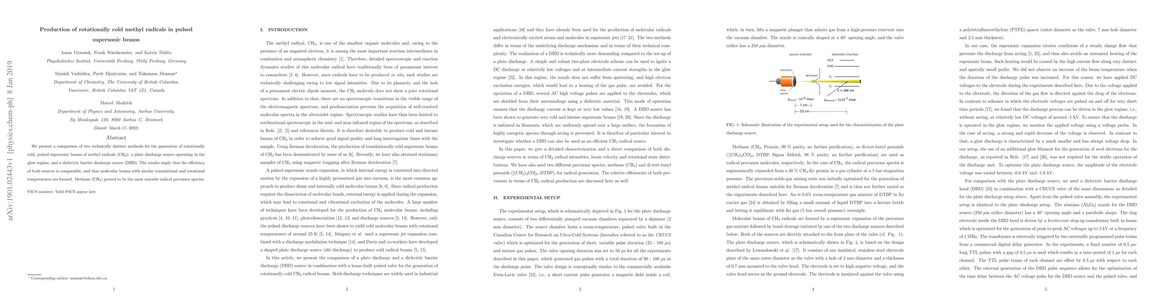 This study compares two methods for generating rotationally cold methyl radicals in pulsed supersonic beams: a plate discharge source and a dielectric barrier discharge source. Both methods produce comparable efficiency and similar translational and rotational temperatures, with methane (CH4) identified as the optimal precursor.