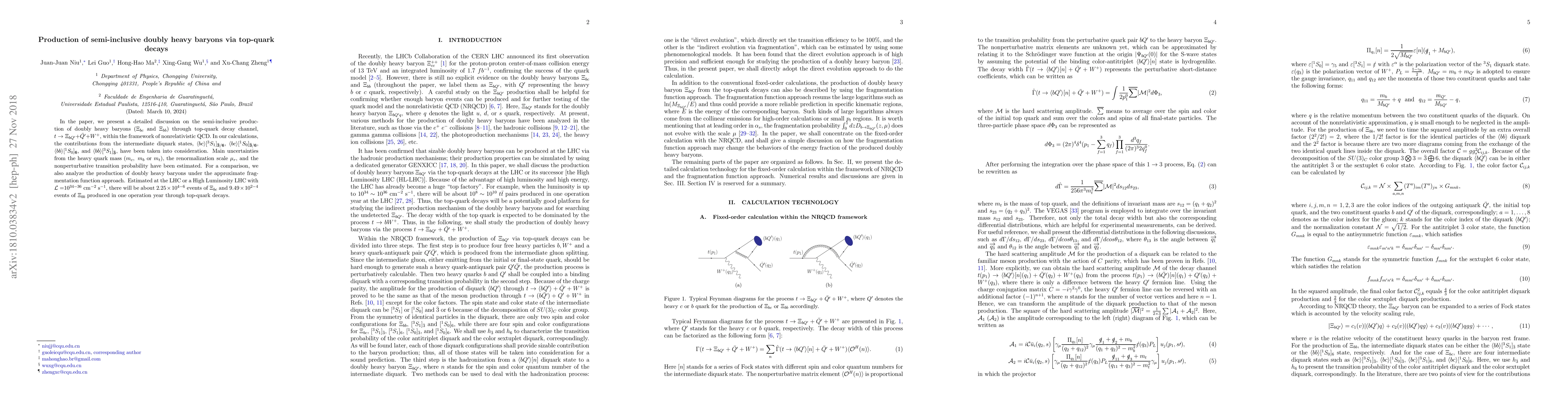 In the paper, we present a detailed discussion on the semi-inclusive production of doubly heavy baryons ($\Xi_{bc}$ and $\Xi_{bb}$) through top-quark decay channel, $t\rightarrow \Xi_{bQ^{\prime}}+ \bar {Q^{\prime}} + W^+ $, within the framework of non-relativistic QCD (NRQCD). In our calculations, the contributions from the intermediate diquark states, $\langle bc\rangle[^{3}S_{1}]_{\mathbf{\bar 3}/ \mathbf{6}}$, $\langle bc\rangle[^{1}S_{0}]_{\mathbf{\bar 3}/ \mathbf{6}}$, $\langle bb\rangle[^{1}S_{0}]_{\mathbf{6}}$ and $\langle bb\rangle[^{3}S_{1}]_{\mathbf{\bar 3}}$, have been taken into consideration. Main uncertainties from the heavy quark mass $(m_c,~m_b~\mbox{or}~m_t)$, the renormalization scale $\mu_r$, and the nonperturbative transition probability have been estimated. For a comparison, we also analyze the production of doubly heavy baryons under the approximate fragmentation function approach. Estimated at the LHC or a High Luminosity LHC with $\mathcal{L}$ =$10^{34-36}~\rm{cm}^{-2}~\rm{s}^{-1}$, there will be about $2.25\times10^{4-6}$ events of $\Xi_{bc}$ and $9.49\times10^{2-4}$ events of $\Xi_{bb}$ produced in one operation year through top-quark decays.