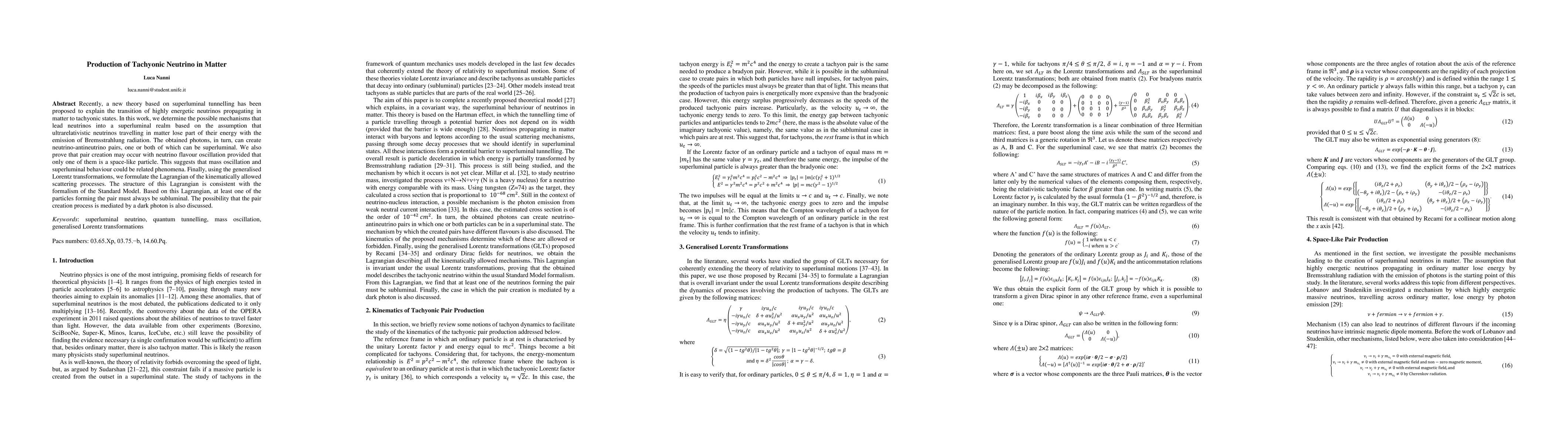 Recently, a new theory based on superluminal tunnelling has been proposed to explain the transition of highly energetic neutrinos propagating in matter to tachyonic states. In this work, we determine the possible mechanisms that lead neutrinos into a superluminal realm based on the assumption that ultrarelativistic neutrinos travelling in matter lose part of their energy with the emission of Bremsstrahlung radiation. The obtained photons, in turn, can create neutrino antineutrino pairs, one or both of which can be superluminal. We also prove that pair creation may occur with neutrino flavour oscillation provided that only one of them is a space-like particle. This suggests that mass oscillation and superluminal behaviour could be related phenomena. Finally, using the generalised Lorentz transformations, we formulate the Lagrangian of the kinematically allowed scattering processes. The structure of this Lagrangian is consistent with the formalism of the Standard Model. Based on this Lagrangian, at least one of the particles forming the pair must always be subluminal. The possibility that the pair creation process is mediated by a dark photon is also discussed.