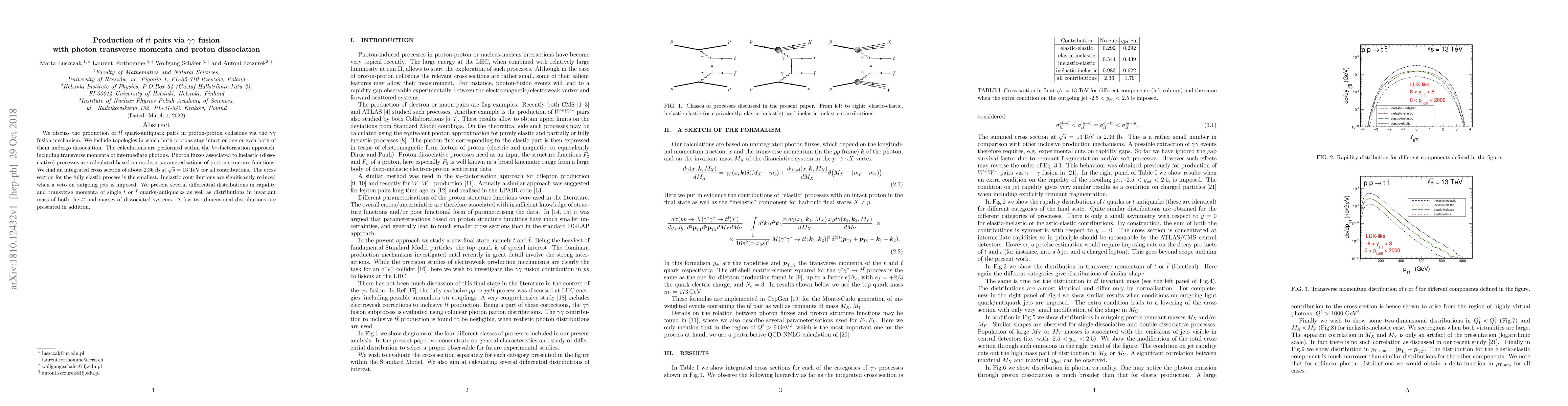 This paper investigates the production of $t\bar t$ pairs in proton-proton collisions via $\gamma\gamma$ fusion, considering both elastic and inelastic processes where protons may dissociate. The study yields an integrated cross section of 2.36 fb at 13 TeV, with inelastic contributions significantly reduced by jet vetoes.