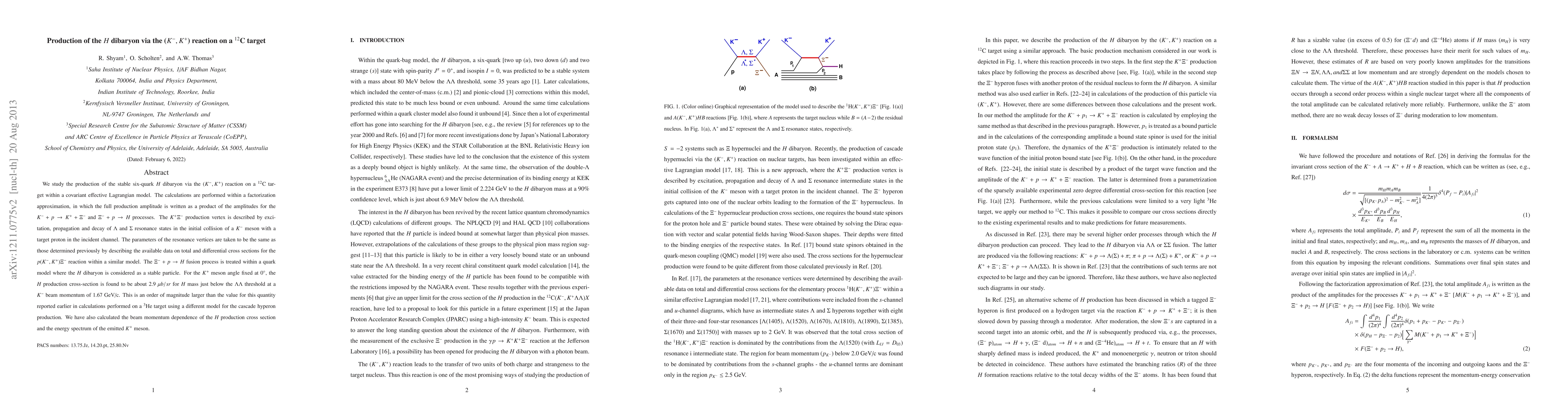 We study the production of the stable six-quark $H$ dibaryon via the $(K^-,K^+)$ reaction on a $^{12}$C target within a covariant effective Lagrangian model. The calculations are performed within a factorization approximation, in which the full production amplitude is written as a product of the amplitudes for the $K^- + p \to K^+ + \Xi^-$ and $\Xi^- + p \to H$ processes. The $K^+\Xi^-$ production vertex is described by excitation, propagation and decay of $\Lambda$ and $\Sigma$ resonance states in the initial collision of a $K^-$ meson with a target proton in the incident channel. The parameters of the resonance vertices are taken to be the same as those determined previously by describing the available data on total and differential cross sections for the $p(K^-, K^+)\Xi^-$ reaction within a similar model. The $\Xi^- + p \to H$ fusion process is treated within a quark model where the $H$ dibaryon is considered as a stable particle. For the $K^+$ meson angle fixed at 0$^o$, the $H$ production cross-section is found to be about 2.9 $\mu b/sr$ for $H$ mass just below the $\Lambda \Lambda$ threshold at a $K^-$ beam momentum of 1.67 GeV/c. This is an order of magnitude larger than the value for this quantity reported earlier in calculations performed on a $^3$He target using a different model for the cascade hyperon production. We have also calculated the beam momentum dependence of the $H$ production cross section and the energy spectrum of the emitted $K^+$ meson.