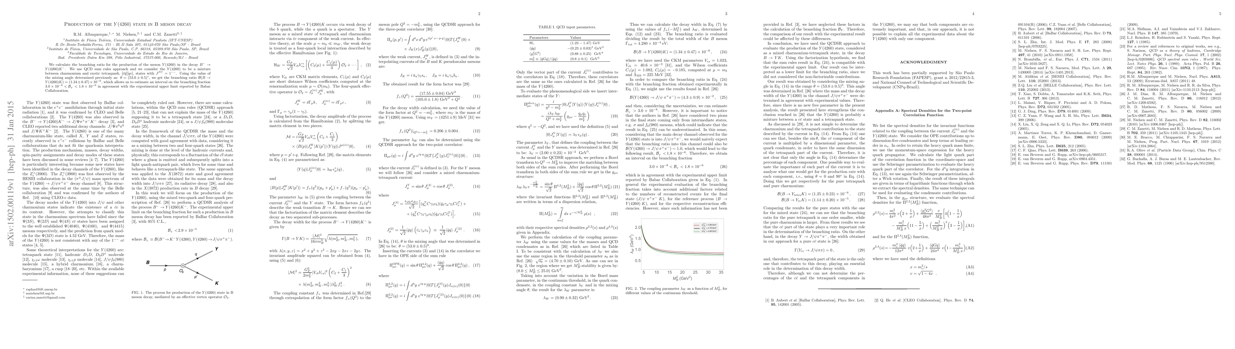 We calculate the branching ratio for the production of the meson $Y(4260)$ in the decay $B^- \to Y(4260)K^-$. We use QCD sum rules approach and we consider the $Y(4260)$ to be a mixture between charmonium and exotic tetraquark, $[\bar{c}\bar{q}][qc]$, states with $J^{PC}=1^{--}$. Using the value of the mixing angle determined previously as: $\theta=(53.0\pm0.5)^\circ$, we get the branching ratio $\mathcal{B}(B\to Y(4260)K)=(1.34\pm0.47)\times10^{-6}$, which allows us to estimate an interval on the branching fraction $3.0 \times 10^{-8} < {\mathcal B}_{_Y} < 1.8 \times 10^{-6}$ in agreement with the experimental upper limit reported by Babar Collaboration.
