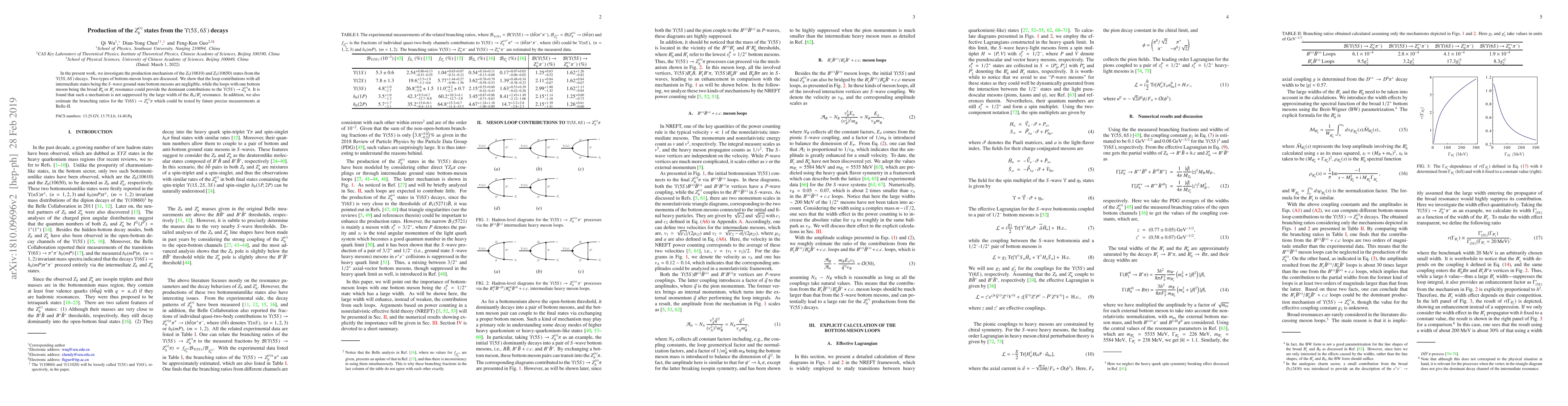 In the present work, we investigate the production mechanism of the $Z_b(10610)$ and $Z_b(10650)$ states from the $\Upsilon(5S,6S)$ decays. Two types of bottom-meson loops are discussed. We show that the loop contributions with all intermediate states being the $S$-wave ground state bottom mesons are negligible, while the loops with one bottom meson being the broad $B_0^\ast$ or $B_1^\prime$ resonance could provide the dominant contributions to the $\Upsilon(5S) \to Z_b^{(\prime)} \pi$. It is found that such a mechanism is not suppressed by the large width of the $B_0/B_1'$ resonance. In addition, we also estimate the branching ratios for the $\Upsilon(6S) \to Z_b^{(\prime)} \pi$ which could be tested by future precise measurements at Belle-II.