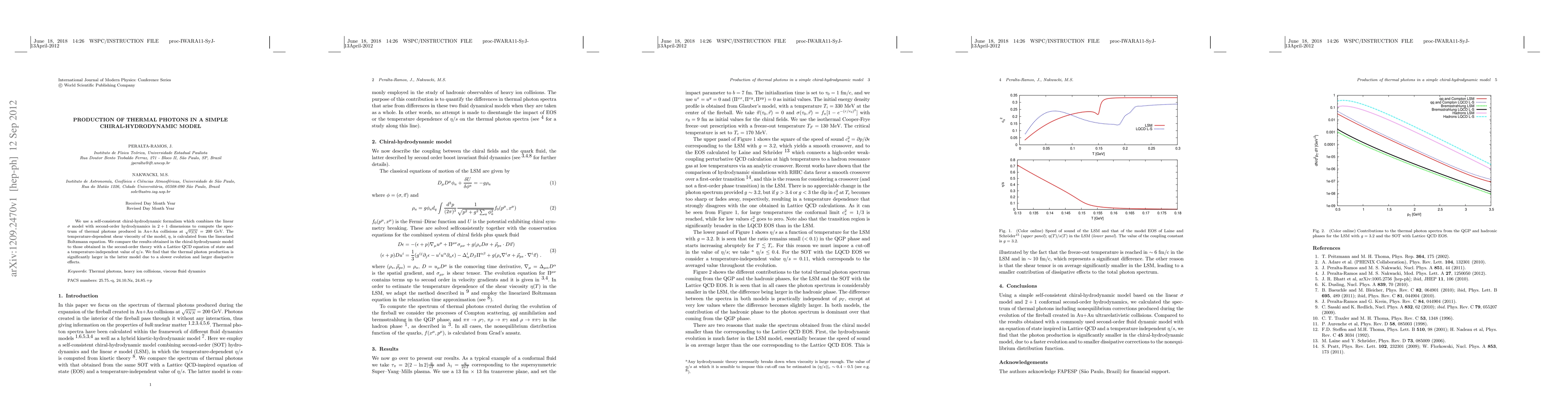 We use a self-consistent chiral-hydrodynamic formalism which combines the linear $\sigma$ model with second-order hydrodynamics in 2+1 dimensions to compute the spectrum of thermal photons produced in Au+Au collisions at $\sqrt{s_{NN}}=200$ GeV. The temperature-dependent shear viscosity of the model, $\eta$, is calculated from the linearized Boltzmann equation. We compare the results obtained in the chiral-hydrodynamic model to those obtained in the second-order theory with a Lattice QCD equation of state and a temperature-independent value of $\eta/s$. We find that the thermal photon production is significantly larger in the latter model due to a slower evolution and larger dissipative effects.