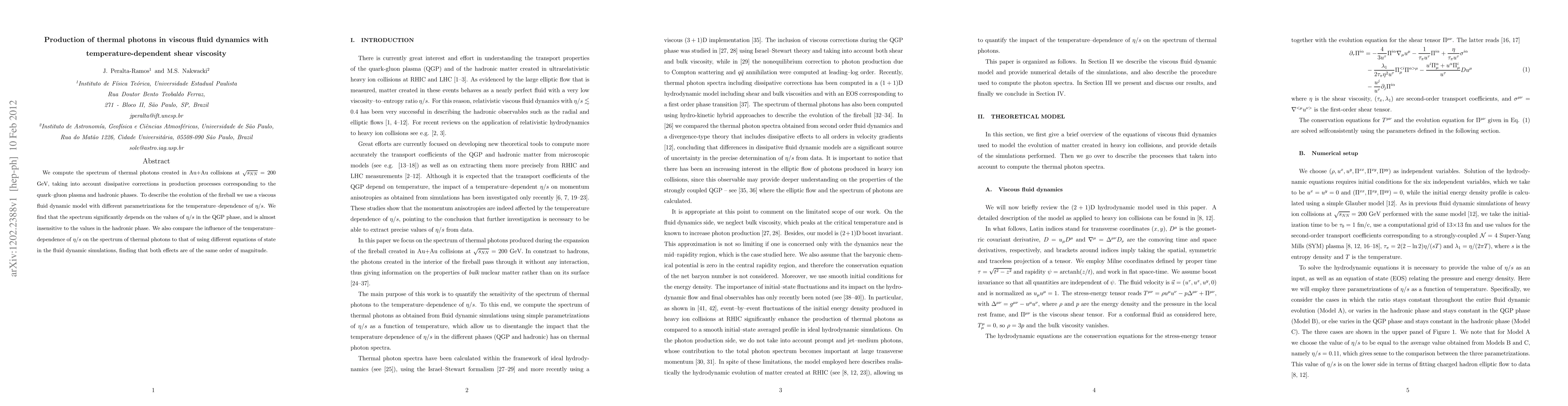 We compute the spectrum of thermal photons created in Au+Au collisions at $\sqrt{s_{NN}}=200$ GeV, taking into account dissipative corrections in production processes corresponding to the quark--gluon plasma and hadronic phases. To describe the evolution of the fireball we use a viscous fluid dynamic model with different parametrizations for the temperature--dependence of $\eta/s$. We find that the spectrum significantly depends on the values of $\eta/s$ in the QGP phase, and is almost insensitive to the values in the hadronic phase. We also compare the influence of the temperature--dependence of $\eta/s$ on the spectrum of thermal photons to that of using different equations of state in the fluid dynamic simulations, finding that both effects are of the same order of magnitude.