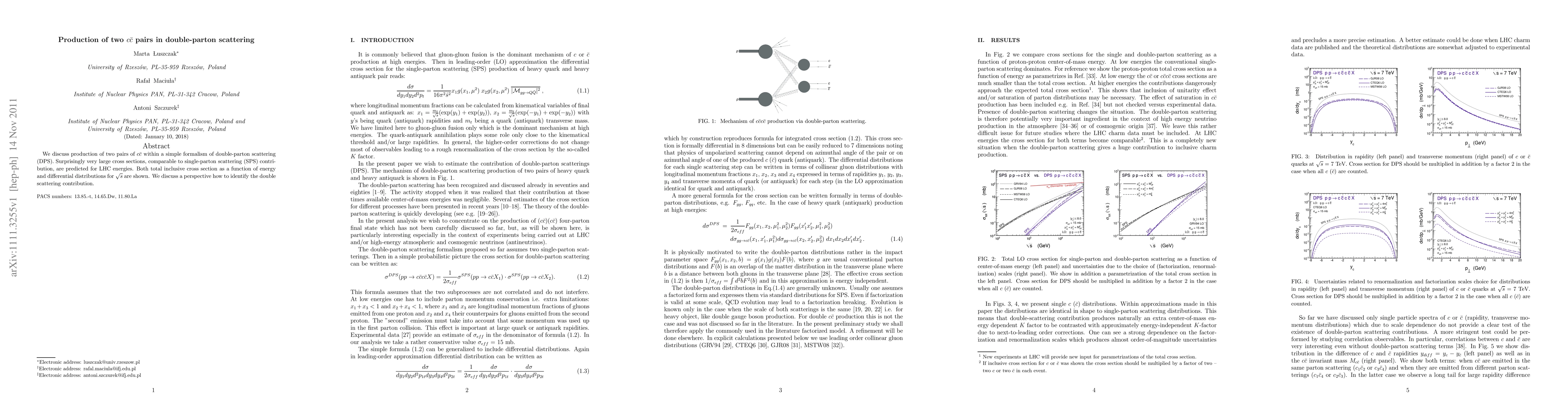 We discuss production of two pairs of $c \bar c$ within a simple formalism of double-parton scattering (DPS). Surprisingly very large cross sections, comparable to single-parton scattering (SPS) contribution, are predicted for LHC energies. Both total inclusive cross section as a function of energy and differential distributions for $\sqrt{s}$ are shown. We discuss a perspective how to identify the double scattering contribution.