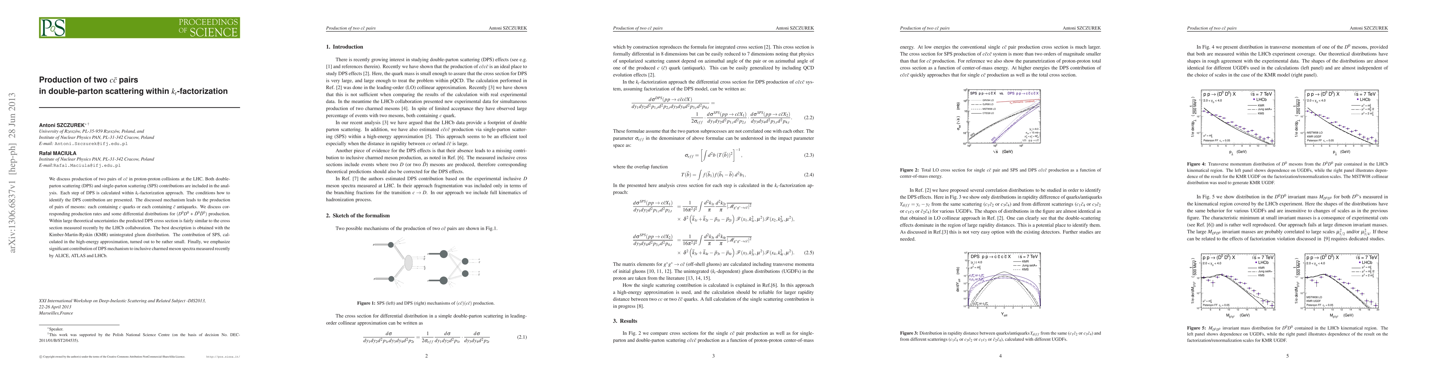 This paper investigates the production of two pairs of $c \bar c$ in proton-proton collisions at the LHC, focusing on double-parton scattering (DPS) within the $k_t$-factorization approach. The study finds that DPS contributes significantly to the production of $D^0 D^0$ and $\bar D^0 \bar D^0$ meson pairs, with results comparable to recent LHCb measurements.