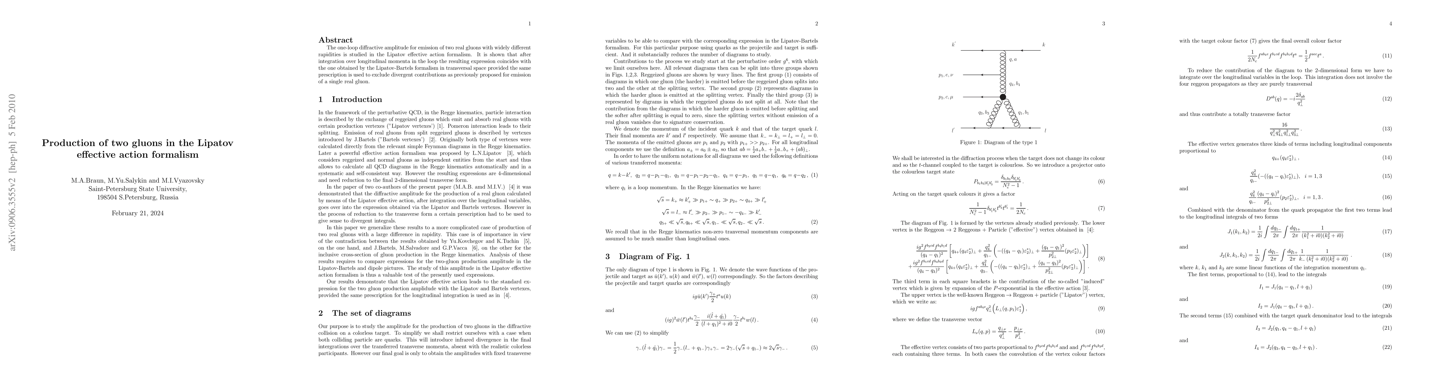 This paper investigates the one-loop diffractive amplitude for the emission of two gluons in the Lipatov effective action formalism, demonstrating that it matches results from the Lipatov-Bartels formalism when divergent contributions are excluded using a consistent prescription.