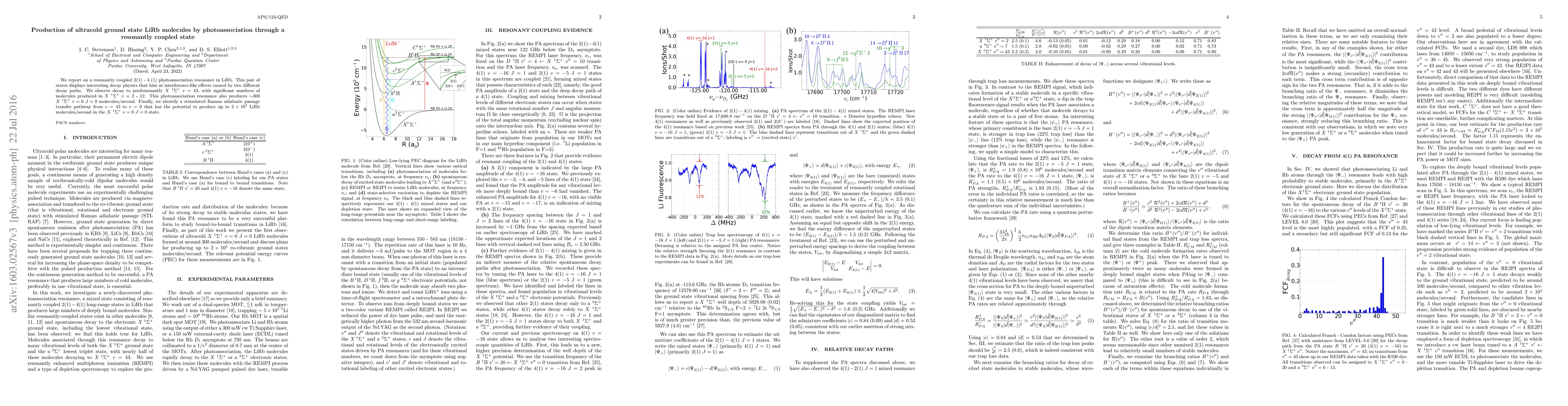 We report on a resonantly coupled 2(1) - 4 (1) photoassociation resonance in LiRb. This pair of states displays interesting decay physics that hint at interference-like effects caused by two different decay paths. We observe decay to predominantly $X \ ^1\Sigma^+ \ v=43$, with significant numbers of molecules produced in $X \ ^1\Sigma^+ \ v=2$ - 12. This photoassociation resonance also produces $\sim$300 $X \ ^1\Sigma^+ \ v=0 \ J=0$ molecules/second. Finally, we identify a stimulated Raman adiabatic passage transfer pathway from $v=43$ to $v=0$ that has the potential to produce up to $2 \times 10^5$ LiRb molecules/second in the $X \ ^1\Sigma^+ \ v=0 \ J=0$ state.