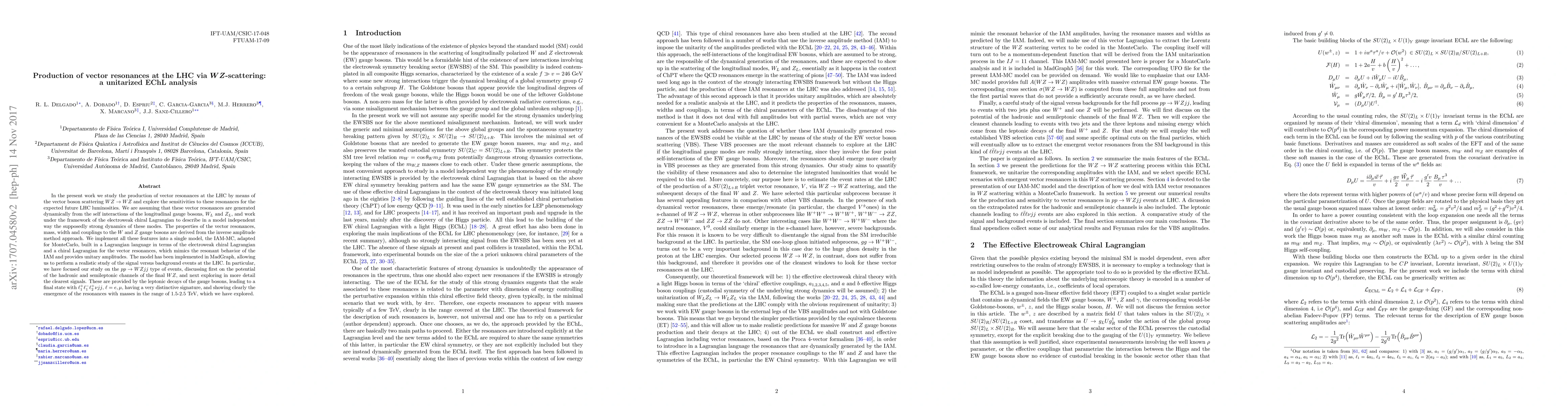 In the present work we study the production of vector resonances at the LHC by means of the vector boson scattering $WZ \to WZ$ and explore the sensitivities to these resonances for the expected future LHC luminosities. We are assuming that these vector resonances are generated dynamically from the self interactions of the longitudinal gauge bosons, $W_L$ and $Z_L$, and work under the framework of the electroweak chiral Lagrangian to describe in a model independent way the supposedly strong dynamics of these modes. The properties of the vector resonances, mass, width and couplings to the $W$ and $Z$ gauge bosons are derived from the inverse amplitude method approach. We implement all these features into a single model, the IAM-MC, adapted for MonteCarlo, built in a Lagrangian language in terms of the electroweak chiral Lagrangian and a chiral Lagrangian for the vector resonances, which mimics the resonant behavior of the IAM and provides unitary amplitudes. The model has been implemented in MadGraph, allowing us to perform a realistic study of the signal versus background events at the LHC. In particular, we have focused our study on the $pp\to WZjj$ type of events, discussing first on the potential of the hadronic and semileptonic channels of the final $WZ$, and next exploring in more detail the clearest signals. These are provided by the leptonic decays of the gauge bosons, leading to a final state with $\ell_1^+\ell_1^-\ell_2^+\nu jj$, $\ell=e,\mu$, having a very distinctive signature, and showing clearly the emergence of the resonances with masses in the range of 1.5-2.5 TeV, which we have explored.