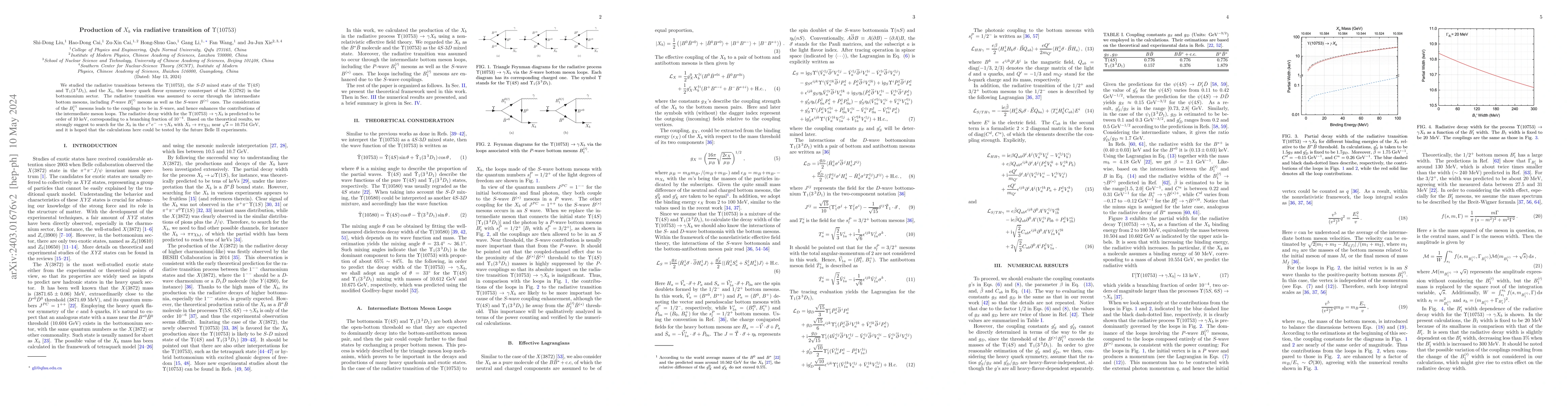 This study investigates radiative transitions from $\Upsilon(10753)$ to $X_b$ through intermediate bottom mesons, predicting a decay width of about $10~\mathrm{keV}$ and a branching fraction of $10^{-4}$. The research suggests searching for $X_b$ in $e^+e^-\to\gamma X_b$ near $\sqrt{s}=10.754~\mathrm{GeV}$ with future Belle II experiments.
