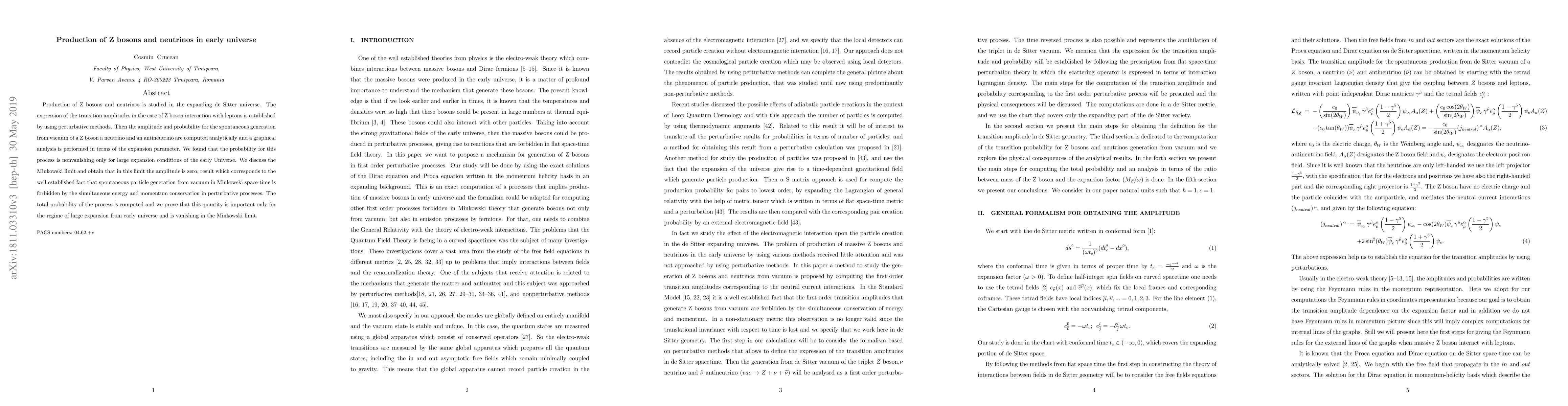 Production of Z bosons and neutrinos is studied in the expanding de Sitter universe. The expression of the transition amplitudes in the case of Z boson interaction with leptons is established by using perturbative methods. Then the amplitude and probability for the spontaneous generation from vacuum of a Z boson a neutrino and an antineutrino are computed analytically and a graphical analysis is performed in terms of the expansion parameter. We found that the probability for this process is nonvanishing only for large expansion conditions of the early Universe. We discuss the Minkowski limit and obtain that in this limit the amplitude is zero, result which corresponds to the well established fact that spontaneous particle generation from vacuum in Minkowski space-time is forbidden by the simultaneous energy and momentum conservation in perturbative processes. The total probability of the process is computed and we prove that this quantity is important only for the regime of large expansion from early universe and is vanishing in the Minkowski limit.