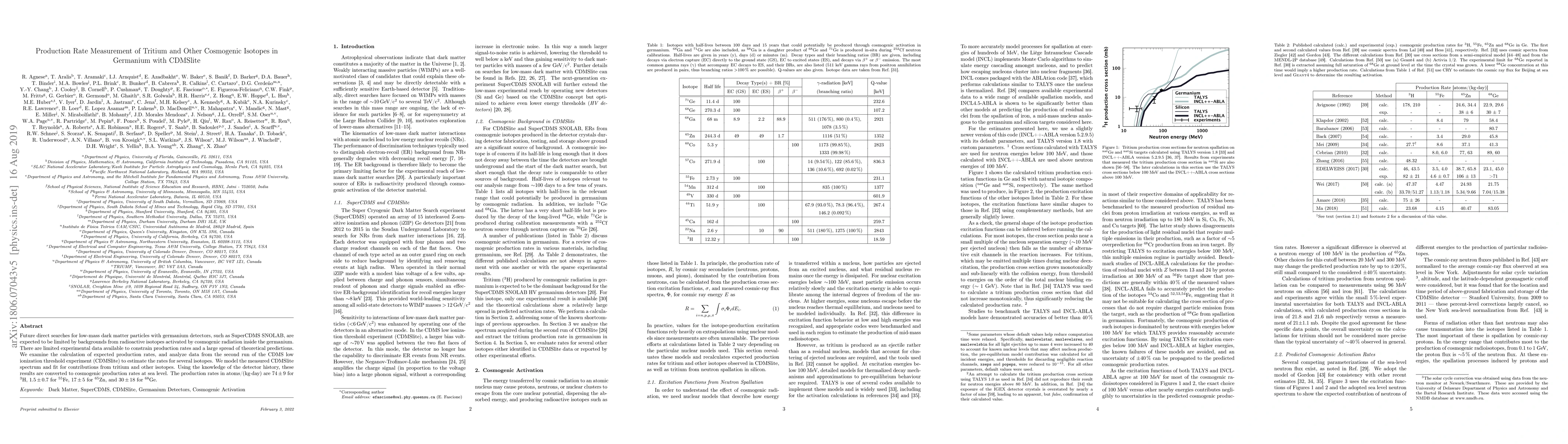 This paper measures production rates for tritium and other cosmogenic isotopes in germanium using CDMSlite data, finding rates of 74$\pm$9 for $^3$H, 1.5$\pm$0.7 for $^{55}$Fe, 17$\pm$5 for $^{65}$Zn, and 30$\pm$18 for $^{68}$Ge, which help constrain backgrounds for future dark matter searches.