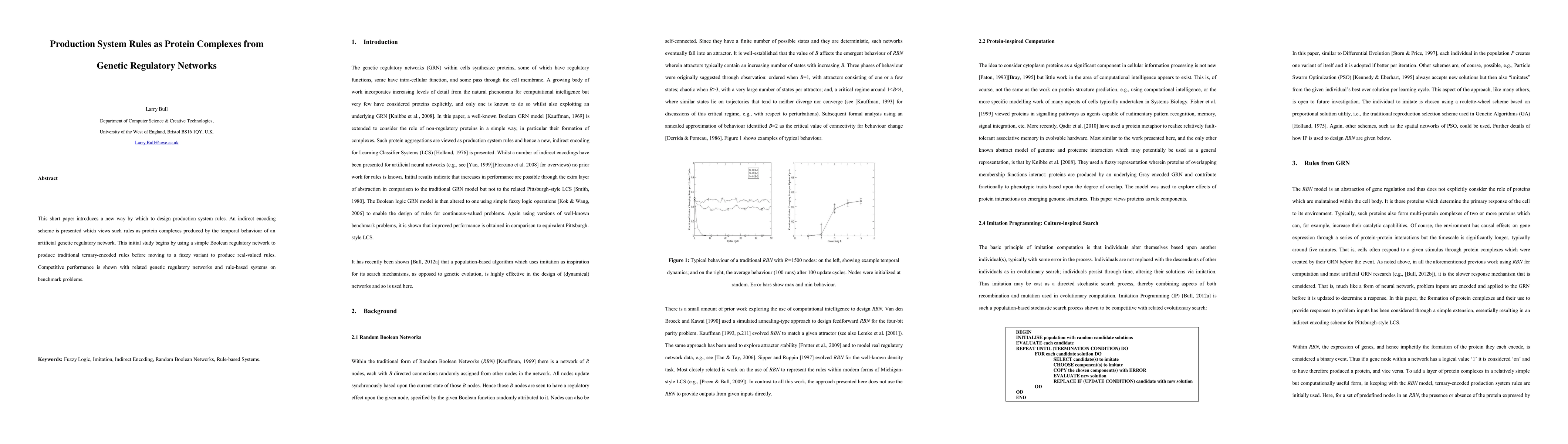 This short paper introduces a new way by which to design production system rules. An indirect encoding scheme is presented which views such rules as protein complexes produced by the temporal behaviour of an artificial genetic regulatory network. This initial study begins by using a simple Boolean regulatory network to produce traditional ternary-encoded rules before moving to a fuzzy variant to produce real-valued rules. Competitive performance is shown with related genetic regulatory networks and rule-based systems on benchmark problems.