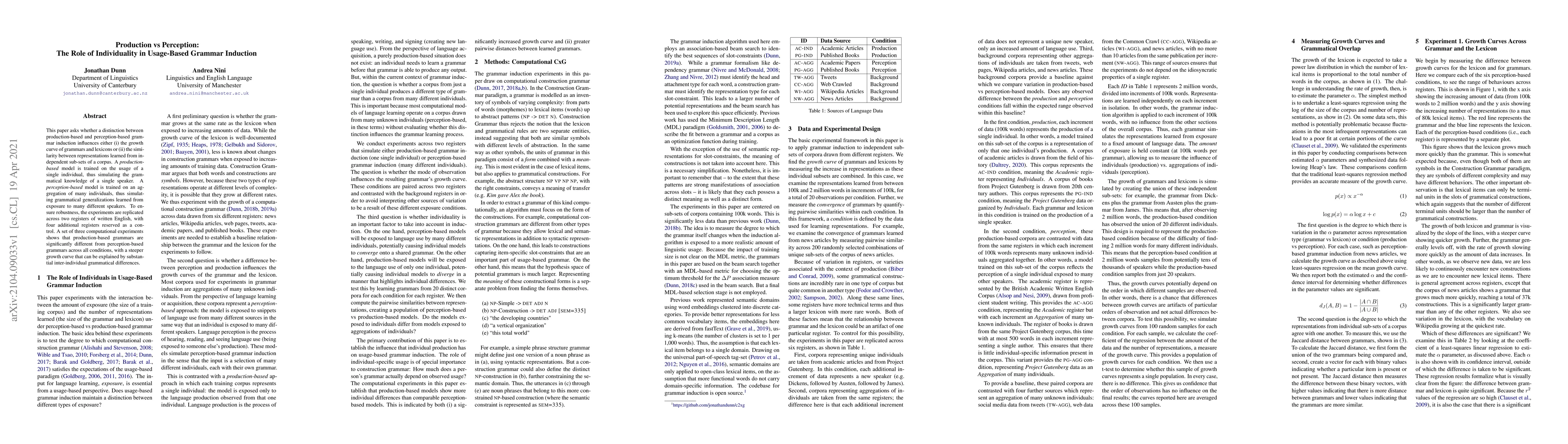 This paper asks whether a distinction between production-based and perception-based grammar induction influences either (i) the growth curve of grammars and lexicons or (ii) the similarity between representations learned from independent sub-sets of a corpus. A production-based model is trained on the usage of a single individual, thus simulating the grammatical knowledge of a single speaker. A perception-based model is trained on an aggregation of many individuals, thus simulating grammatical generalizations learned from exposure to many different speakers. To ensure robustness, the experiments are replicated across two registers of written English, with four additional registers reserved as a control. A set of three computational experiments shows that production-based grammars are significantly different from perception-based grammars across all conditions, with a steeper growth curve that can be explained by substantial inter-individual grammatical differences.