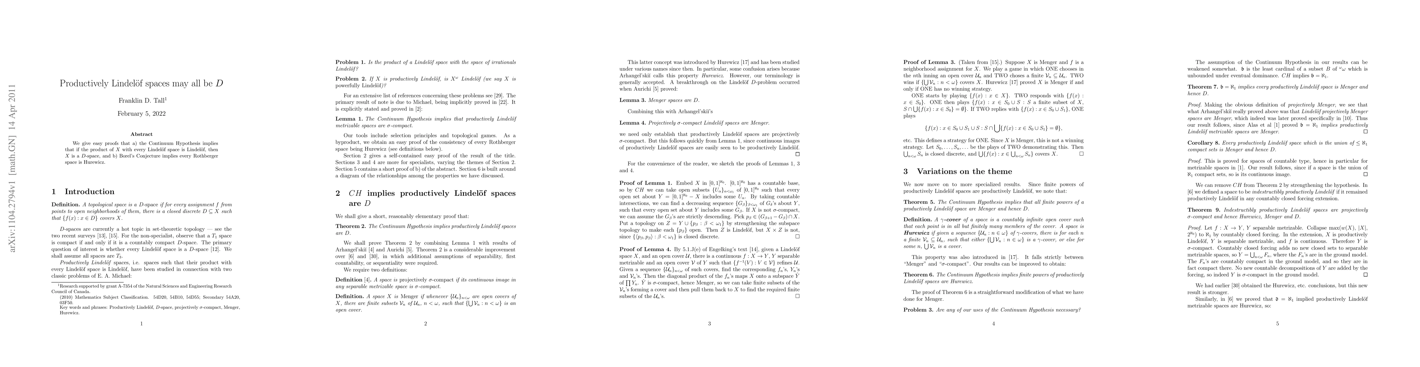 Summary: This paper provides proofs under the Continuum Hypothesis that a productively Lindelof space X is a D-space if its product with any Lindelof space remains Lindelof, and under Borel's Conjecture, it shows that every Rothberger space is Hurewicz.