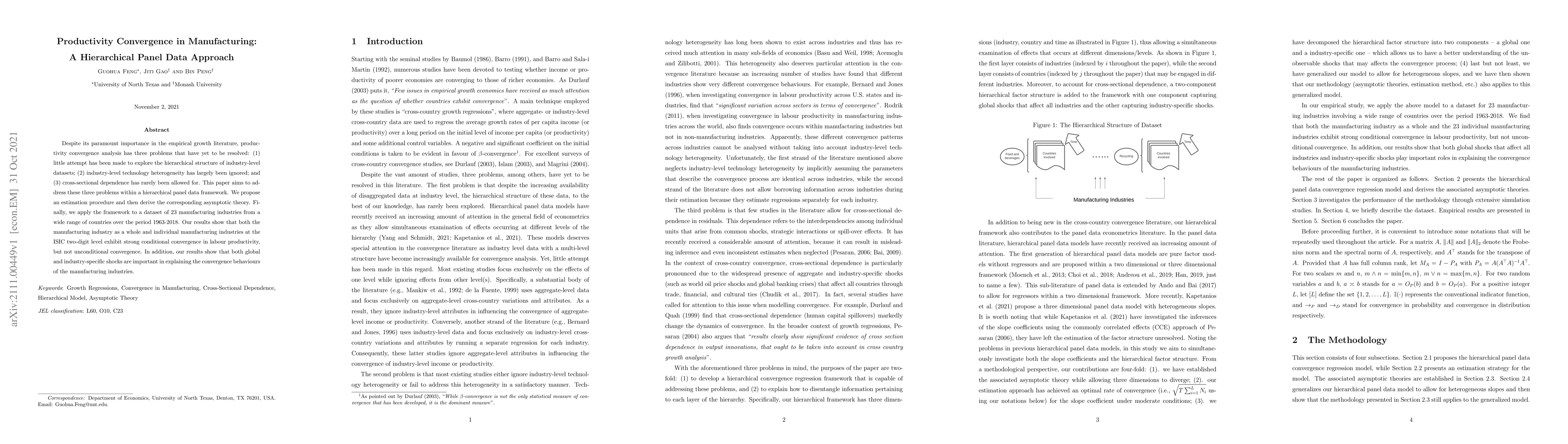 This paper proposes a hierarchical panel data approach to analyze productivity convergence in manufacturing industries, addressing issues of dataset structure, technology heterogeneity, and cross-sectional dependence. The study finds strong conditional but not unconditional convergence in labor productivity across 23 manufacturing industries globally from 1963-2018, highlighting the role of global and industry-specific shocks.