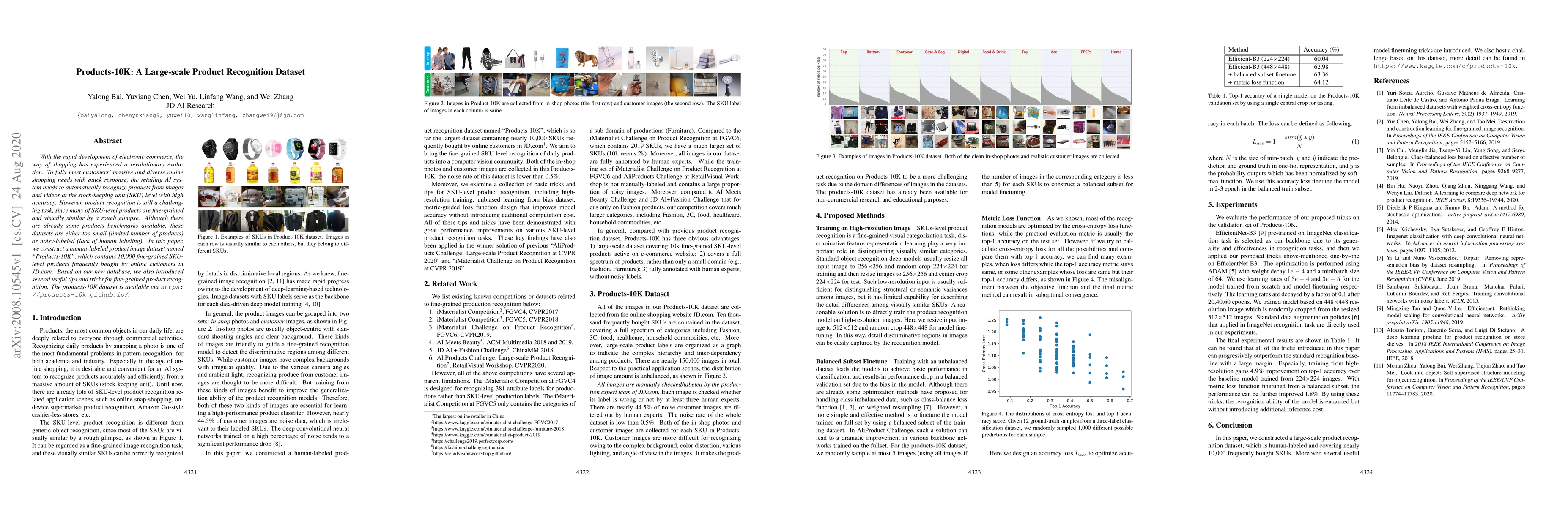 With the rapid development of electronic commerce, the way of shopping has experienced a revolutionary evolution. To fully meet customers' massive and diverse online shopping needs with quick response, the retailing AI system needs to automatically recognize products from images and videos at the stock-keeping unit (SKU) level with high accuracy. However, product recognition is still a challenging task, since many of SKU-level products are fine-grained and visually similar by a rough glimpse. Although there are already some products benchmarks available, these datasets are either too small (limited number of products) or noisy-labeled (lack of human labeling). In this paper, we construct a human-labeled product image dataset named "Products-10K", which contains 10,000 fine-grained SKU-level products frequently bought by online customers in JD.com. Based on our new database, we also introduced several useful tips and tricks for fine-grained product recognition. The products-10K dataset is available via https://products-10k.github.io/.
