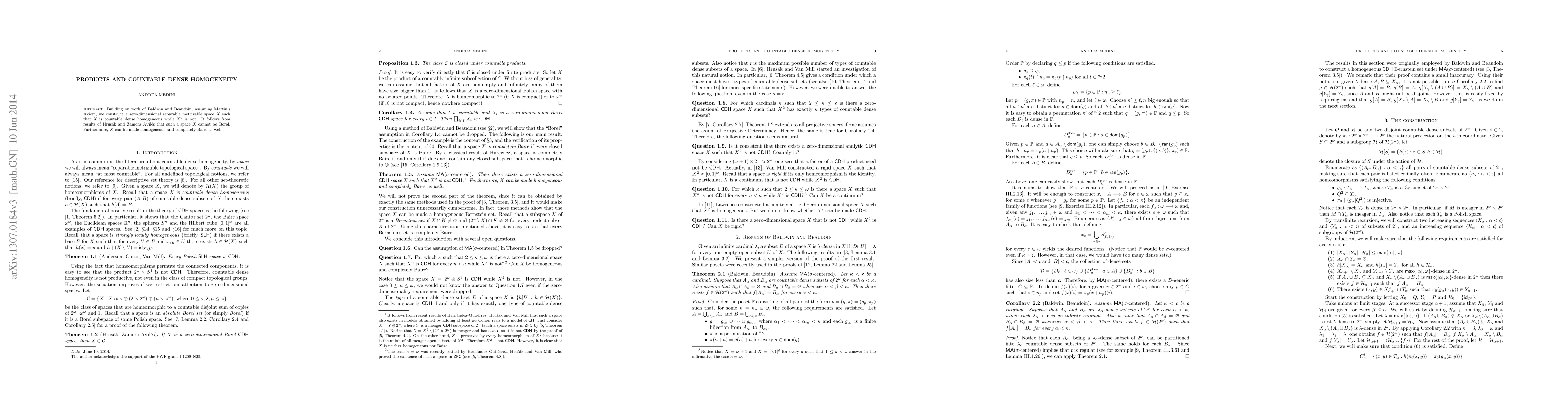 This paper constructs a zero-dimensional separable metrizable space $X$ under Martin's Axiom that is countable dense homogeneous but $X^2$ is not, demonstrating that $X$ cannot be Borel and can be made homogeneous and completely Baire.