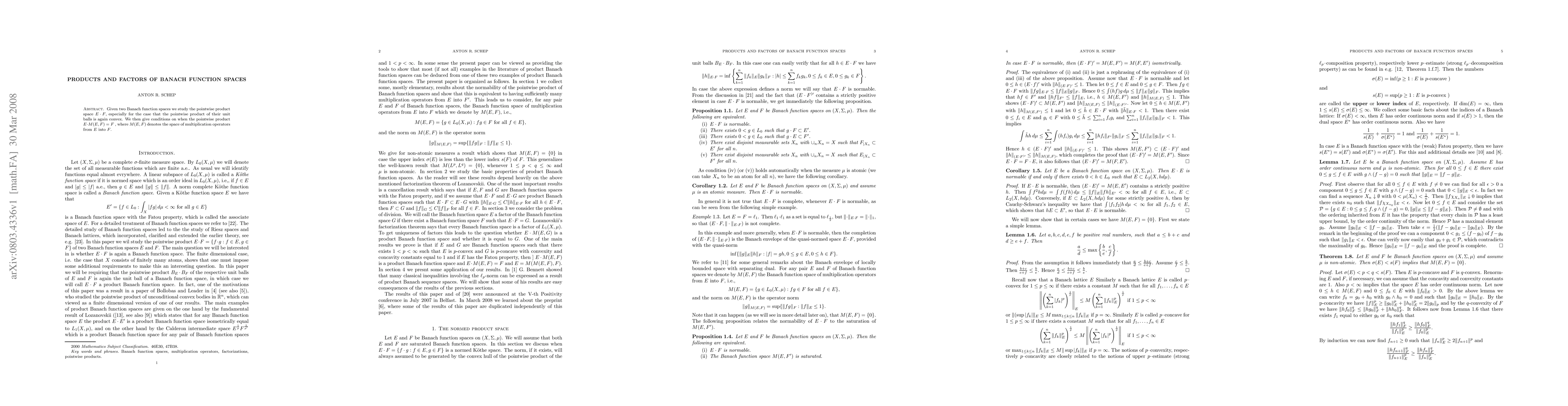 Given two Banach function spaces we study the pointwise product space E.F, especially for the case that the pointwise product of their unit balls is again convex. We then give conditions on when the pointwise product E . M(E, F)=F, where M(E,F) denotes the space of multiplication operators from E into F.