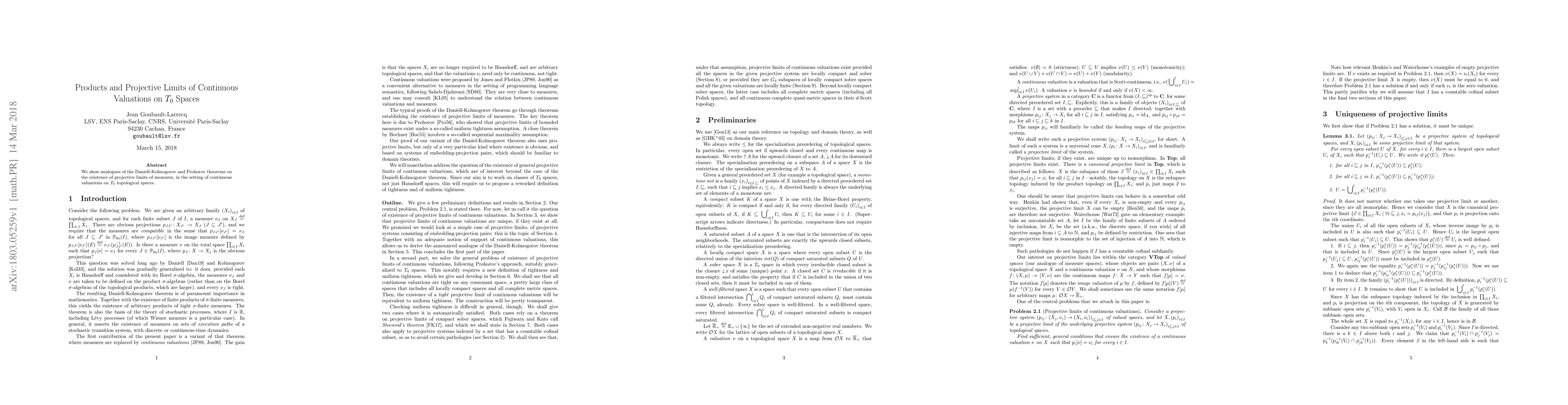 This paper establishes the Daniell-Kolmogorov and Prohorov theorems for projective limits of continuous valuations on $T_0$ spaces, demonstrating their existence and relevance in topological contexts.