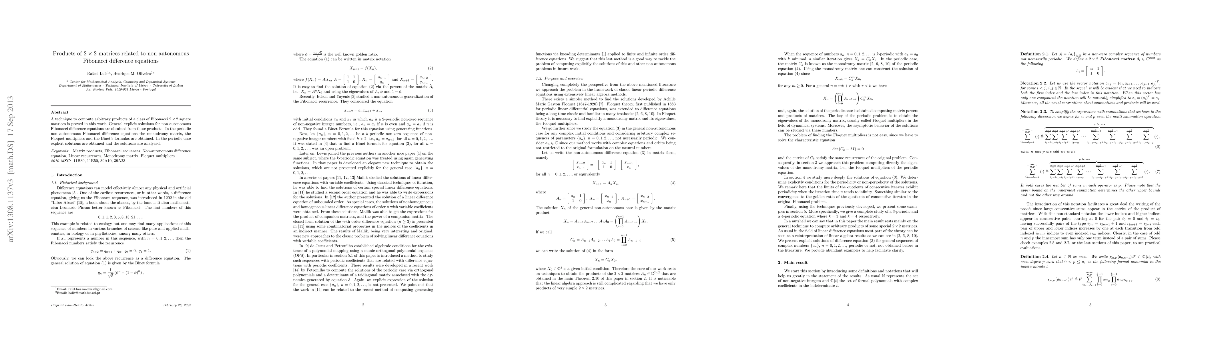 This paper presents a method to compute products of specific Fibonacci $2\times2$ matrices, leading to general explicit solutions for non-autonomous Fibonacci difference equations. It also derives the monodromy matrix, Floquet multipliers, and Binet's formulas for periodic non-autonomous cases.