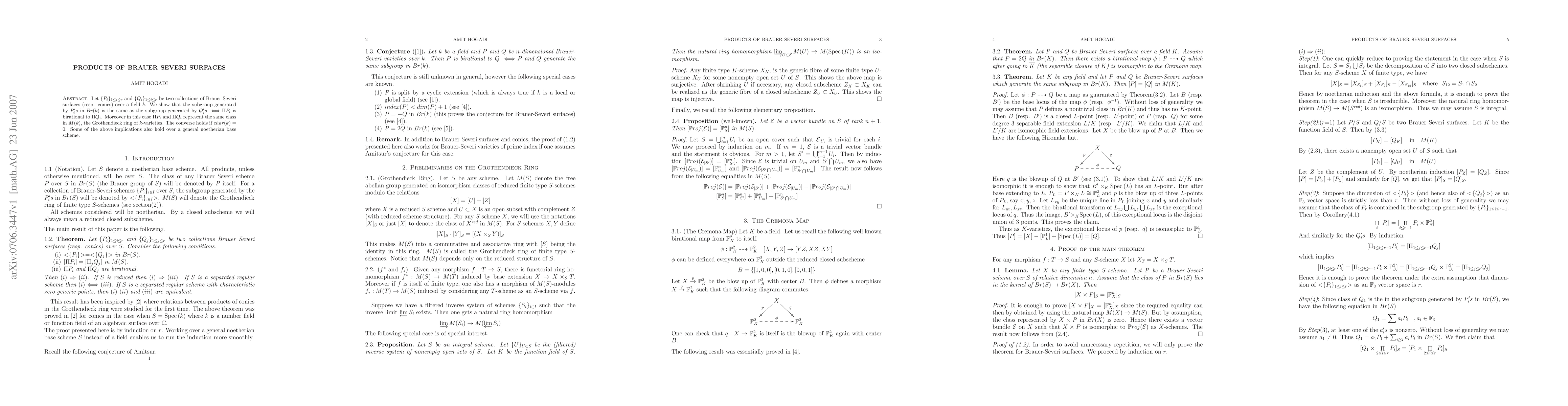 Let $\{P_i\}_{1 \leq i \leq r}$ and $\{Q_i\}_{1 \leq i \leq r}$ be two collections of Brauer Severi surfaces (resp. conics) over a field $k$. We show that the subgroup generated by the $P_i's$ in $Br(k)$ is the same as the subgroup generated by the $Q_i's$ \iff $\Pi P_i $ is birational to $\Pi Q_i$. Moreover in this case $\Pi P_i$ and $\Pi Q_i$ represent the same class in $M(k)$, the Grothendieck ring of $k$-varieties. The converse holds if $char(k)=0$. Some of the above implications also hold over a general noetherian base scheme.