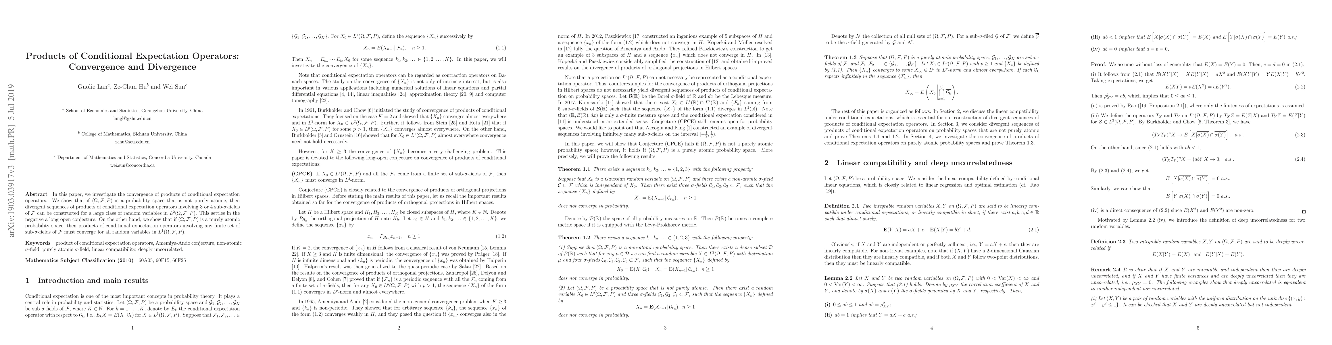 In this paper, we investigate the convergence of products of conditional expectation operators. We show that if $(\Omega,\cal{F},P)$ is a probability space that is not purely atomic, then divergent sequences of products of conditional expectation operators involving 3 or 4 sub-$\sigma$-fields of $\cal{F}$ can be constructed for a large class of random variables in $L^2(\Omega,\cal{F},P)$. This settles in the negative a long-open conjecture. On the other hand, we show that if $(\Omega,\cal{F},P)$ is a purely atomic probability space, then products of conditional expectation operators involving any finite set of sub-$\sigma$-fields of $\cal{F}$ must converge for all random variables in $L^1(\Omega,\cal{F},P)$.