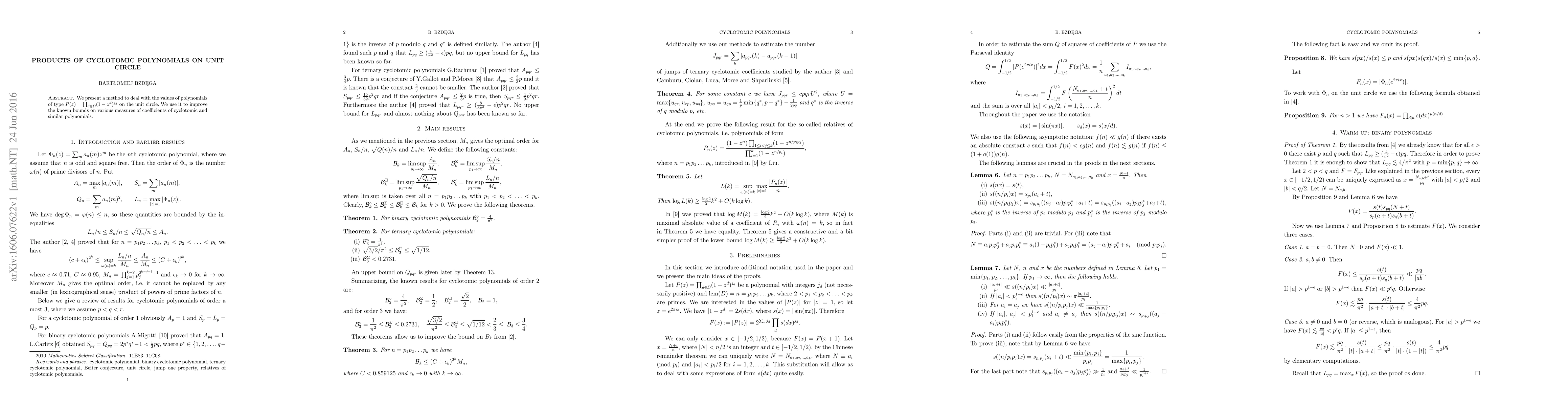 This research develops a novel approach to evaluate polynomials of the form $P(z)=\prod_{d\in D}(1-z^d)^{j_d}$ on the unit circle, leading to improved bounds on the coefficients of cyclotomic and related polynomials.