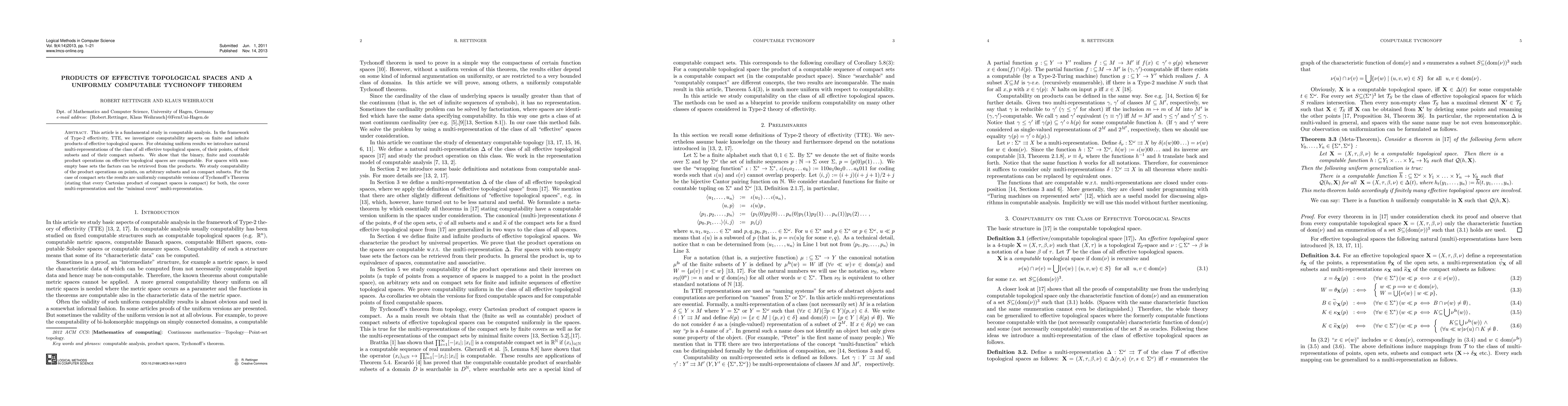 This paper explores computability in effective topological spaces under Type-2 effectivity, demonstrating uniform computability of product operations. It introduces multi-representations for effective topological spaces and proves uniform computability of Tychonoff's Theorem for compact sets.