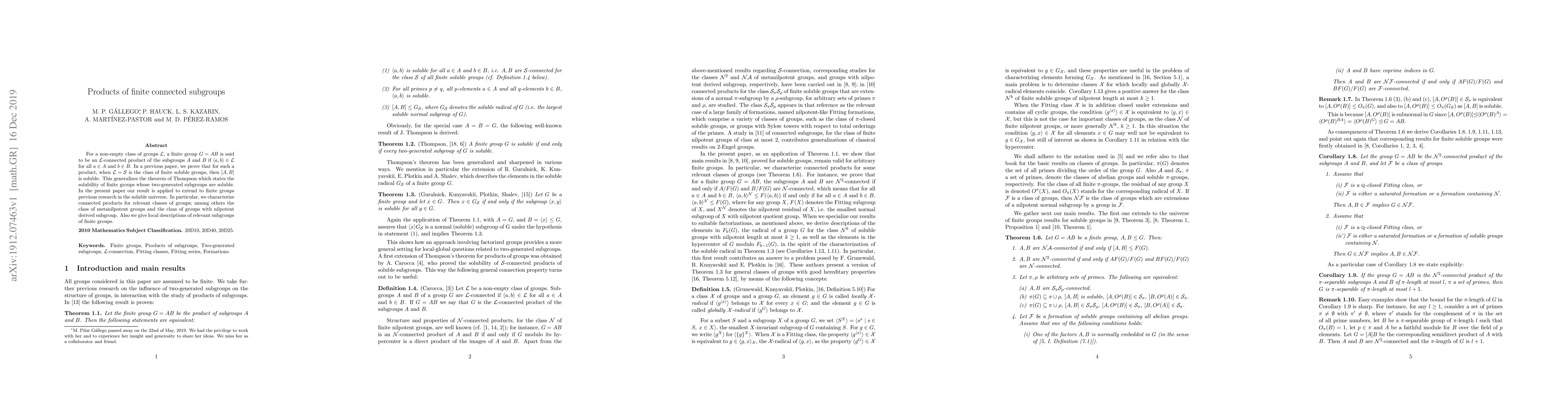 For a non-empty class of groups $\cal L$, a finite group $G = AB$ is said to be an $\cal L$-connected product of the subgroups $A$ and $B$ if $\langle a, b\rangle \in \cal L$ for all $a \in A$ and $b \in B$. In a previous paper, we prove that for such a product, when $\cal L = \cal S$ is the class of finite soluble groups, then $[A,B]$ is soluble. This generalizes the theorem of Thompson which states the solubility of finite groups whose two-generated subgroups are soluble. In the present paper our result is applied to extend to finite groups previous research in the soluble universe. In particular, we characterize connected products for relevant classes of groups; among others the class of metanilpotent groups and the class of groups with nilpotent derived subgroup. Also we give local descriptions of relevant subgroups of finite groups.