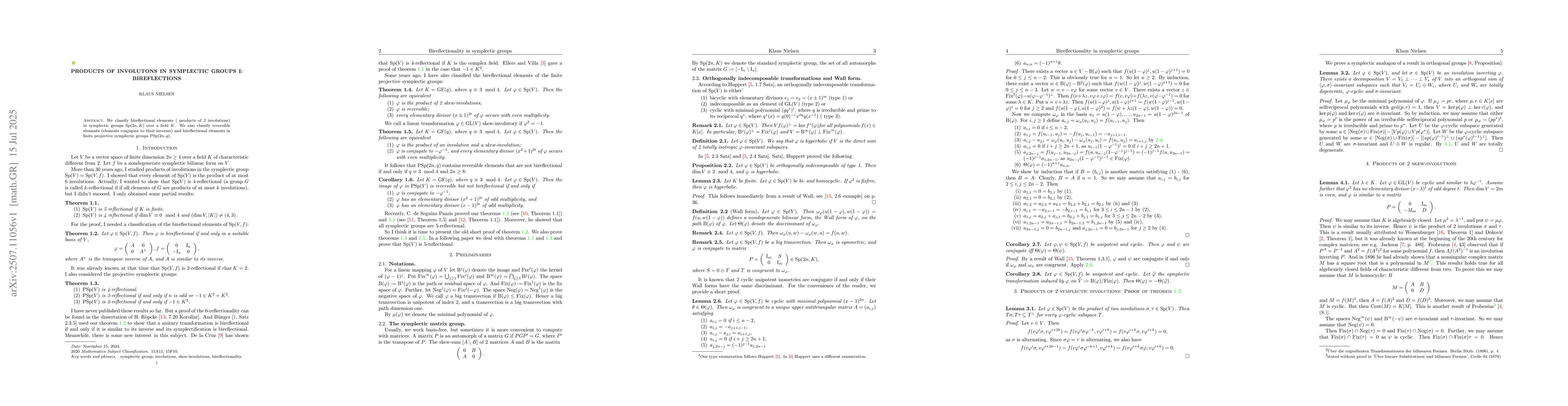 We classify bireflectional elements (products of 2 involutions) in symplectic groups Sp$(2n, K)$ over a field $K$. We also classify rev ersible elements (elements conjugate to their inverses) and bireflectional elements in finite projective symplectic groups PSp$(2n,q)$.