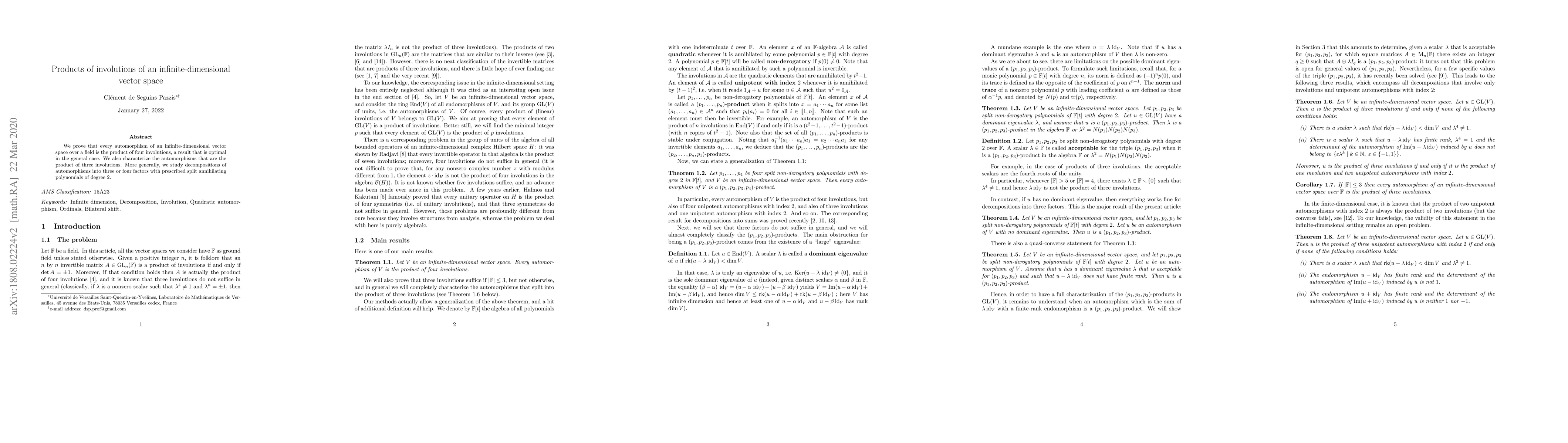 This paper proves that any automorphism of an infinite-dimensional vector space can be expressed as the product of four involutions, establishing optimality. It also characterizes automorphisms that are the product of three involutions and explores decompositions into three or four factors with specific split annihilating polynomials of degree 2.