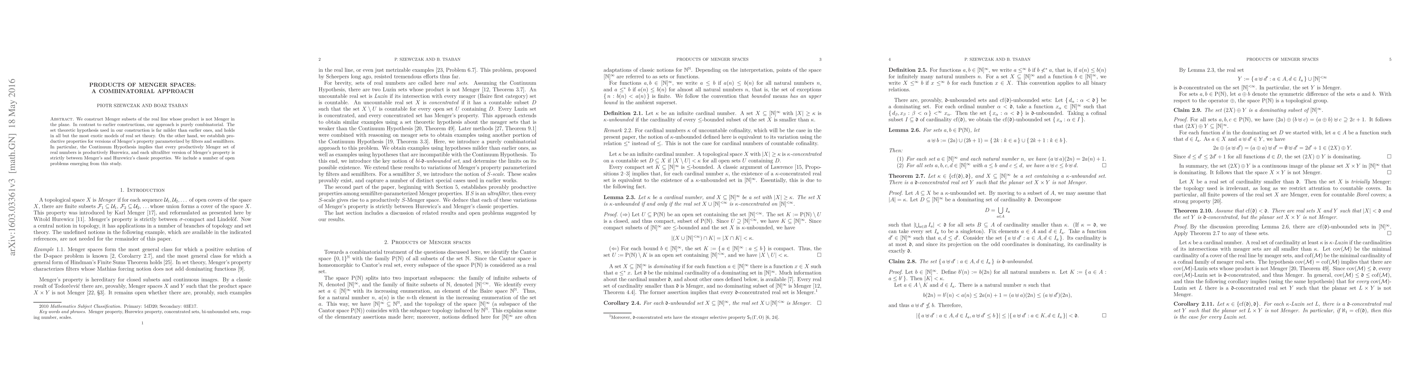We construct Menger subsets of the real line whose product is not Menger in the plane. In contrast to earlier constructions, our approach is purely combinatorial. The set theoretic hypothesis used in our construction is far milder than earlier ones, and holds in all but the most exotic models of real set theory. On the other hand, we establish productive properties for versions of Menger's property parameterized by filters and semifilters. In particular, the Continuum Hypothesis implies that every productively Menger set of real numbers is productively Hurewicz, and each ultrafilter version of Menger's property is strictly between Menger's and Hurewicz's classic properties. We include a number of open problems emerging from this study.