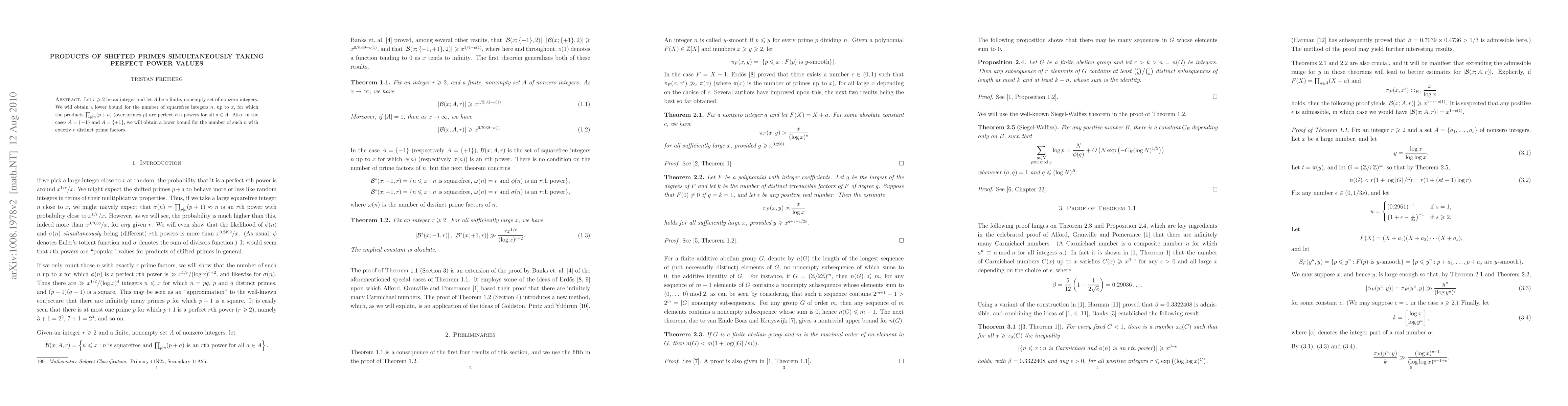 Let $r \ge 2$ be an integer and let $A$ be a finite, nonempty set of nonzero integers. We will obtain a lower bound for the number of squarefree integers $n$, up to $x$, for which the products $\prod_{p \mid n} (p+a)$ (over primes $p$) are perfect $r$th powers for all $a \in A$. Also, in the cases $A = \{-1\}$ and $A = \{+1\}$, we will obtain a lower bound for the number of such $n$ with exactly $r$ distinct prime factors.