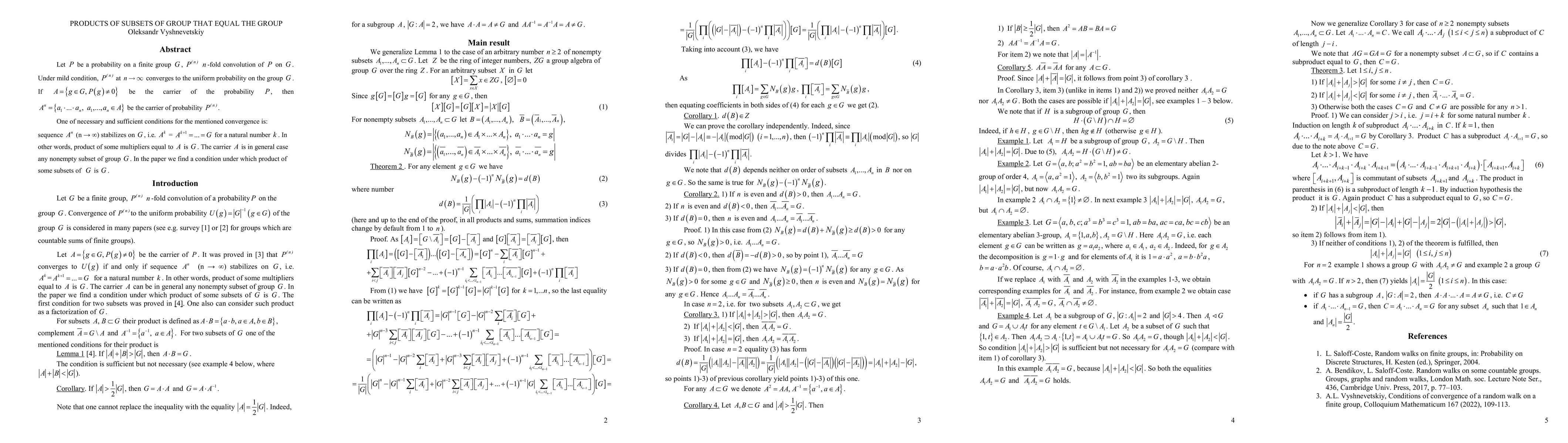 Let $P$ be a probability on a finite group $G$, ${P^{(n)}}$ $n$-fold convolution of $P$ on $G$. Under mild condition, ${P^{(n)}}$ at $n \to \infty $ converges to the uniform probability on the group $G$. If $A = \left\{ {g \in G,\;P\left( g \right) \ne 0} \right\}$ be the carrier of the probability $P$, then ${A^n} = \left\{ {{a_1} \cdot ... \cdot {a_n},\;\;{a_1},...,{a_n} \in A} \right\}$ be the carrier of probability ${P^{(n)}}$. One of necessary and sufficient conditions for the mentioned convergence is: sequence ${A^n}$ at $n \to \infty $ stabilizes on $G$, i.e. ${A^k}$ = ${A^{k + 1}} = ... = G$ for a natural number $k$. In other words, product of some multipliers equal to $A$ is $G$. The carrier $A$ is in general case any nonempty subset of group $G$. In the paper we find a condition under which product of some subsets of $G$ is $G$.
