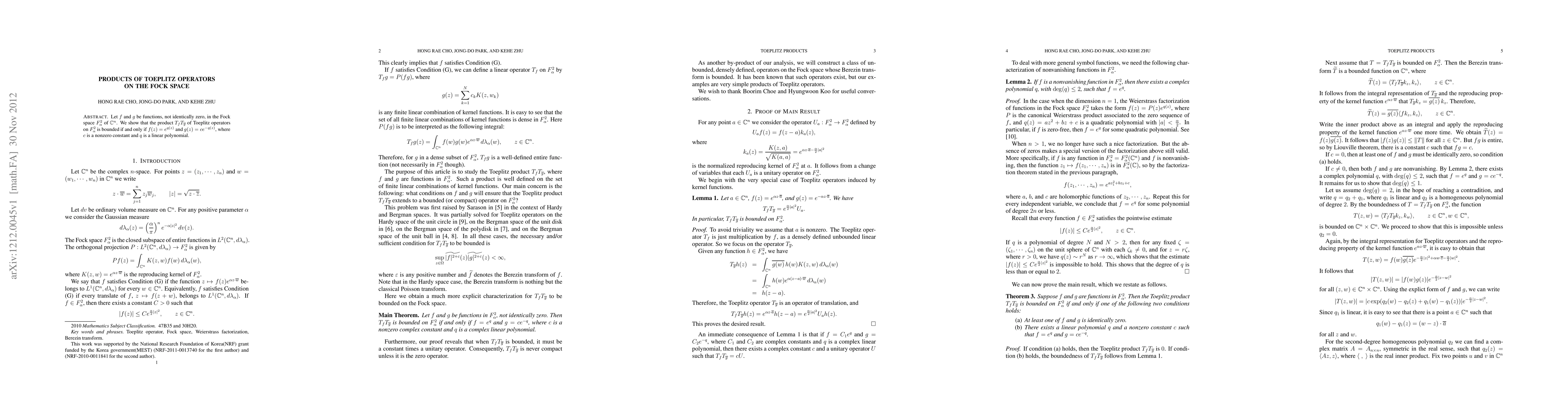 The research analyzes Toeplitz operators on the Fock space, focusing on the product of Toeplitz operators induced by functions f and g. It uses unitary operators Ua and changes of variables, along with properties of the reproducing kernel.