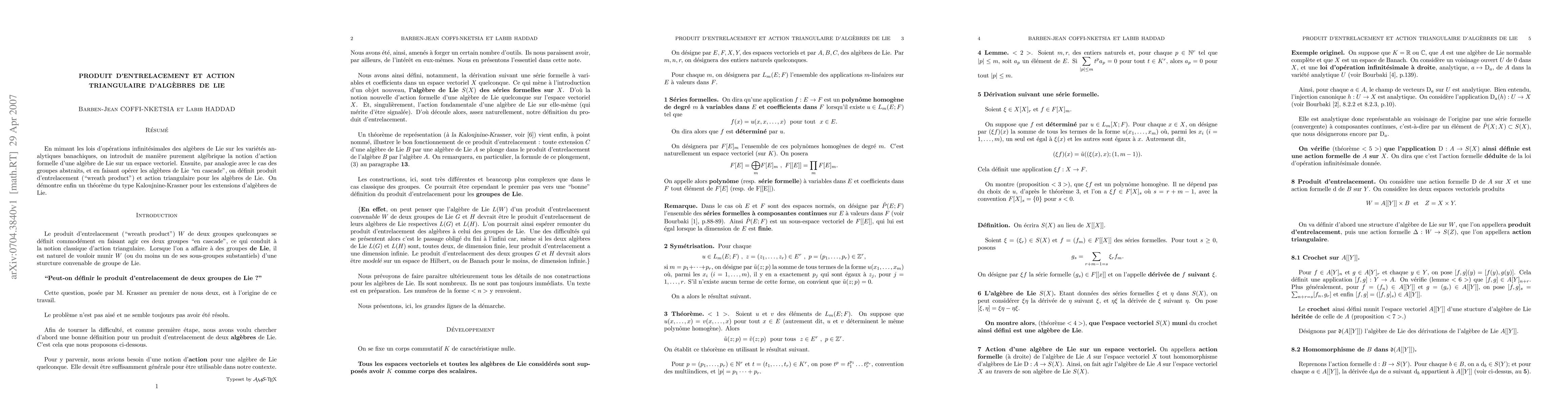 Formal actions of Lie algebras over vector spaces are introduced in a purely algebraic way, as a mimic of infinitesimal operations of Banach Lie algebras over Banach analytic manifolds. In analogy with the case of abstract groups, complete wreath products and triangular actions are then defined for Lie algebras acting "en cascade" over vector spaces. Finally, a Kaloujnine-Krasner type theorem for Lie algebra extensions is proved. ----- En mimant les lois d'op\'erations infinit\'esimales des alg\`ebres de Lie sur les vari\'et\'e s analytiques banachiques, on introduit de mani\`ere purement alg\`ebrique la notion d'action formelle d'une alg\`ebre de Lie sur un espace vectoriel. Ensuite, par analogie avec le cas des groupes abstraits, et en faisant op\'erer les alg\`ebres de Lie "en cascade", on d\'efinit produit d'entrelacement ("wreath product") et action triangulaire pour les alg\`ebres de Lie. On d\'emontre enfin un th\'eor\`eme du type Kaloujnine-Krasner pour les extensions d'alg\`ebres de Lie.