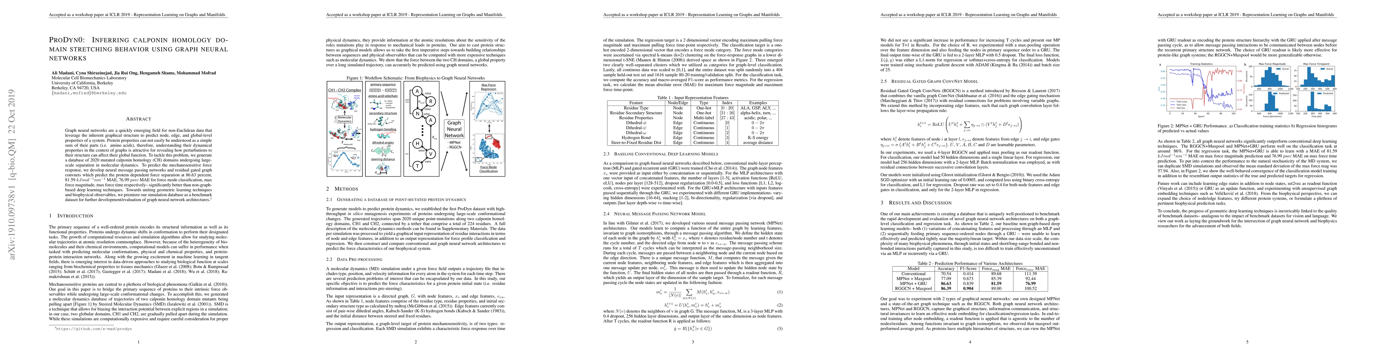 Graph neural networks are a quickly emerging field for non-Euclidean data that leverage the inherent graphical structure to predict node, edge, and global-level properties of a system. Protein properties can not easily be understood as a simple sum of their parts (i.e. amino acids), therefore, understanding their dynamical properties in the context of graphs is attractive for revealing how perturbations to their structure can affect their global function. To tackle this problem, we generate a database of 2020 mutated calponin homology (CH) domains undergoing large-scale separation in molecular dynamics. To predict the mechanosensitive force response, we develop neural message passing networks and residual gated graph convnets which predict the protein dependent force separation at 86.63 percent, 81.59 kJ/mol/nm MAE, 76.99 psec MAE for force mode classification, max force magnitude, max force time respectively-- significantly better than non-graph-based deep learning techniques. Towards uniting geometric learning techniques and biophysical observables, we premiere our simulation database as a benchmark dataset for further development/evaluation of graph neural network architectures.