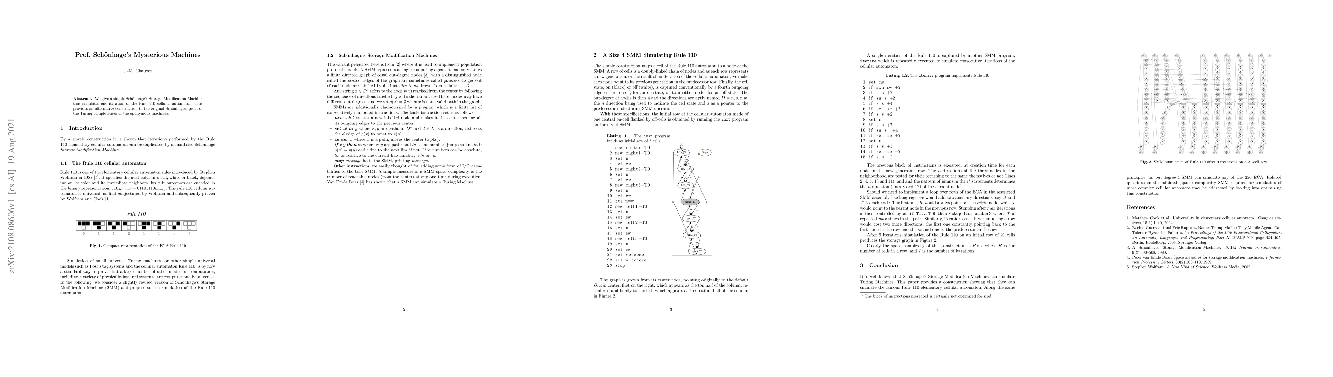 Summary: This paper presents a straightforward Sch\"onhage Storage Modification Machine that simulates one iteration of the Rule 110 cellular automaton, offering an alternative proof of the Turing completeness of Sch\"onhage's machines.
