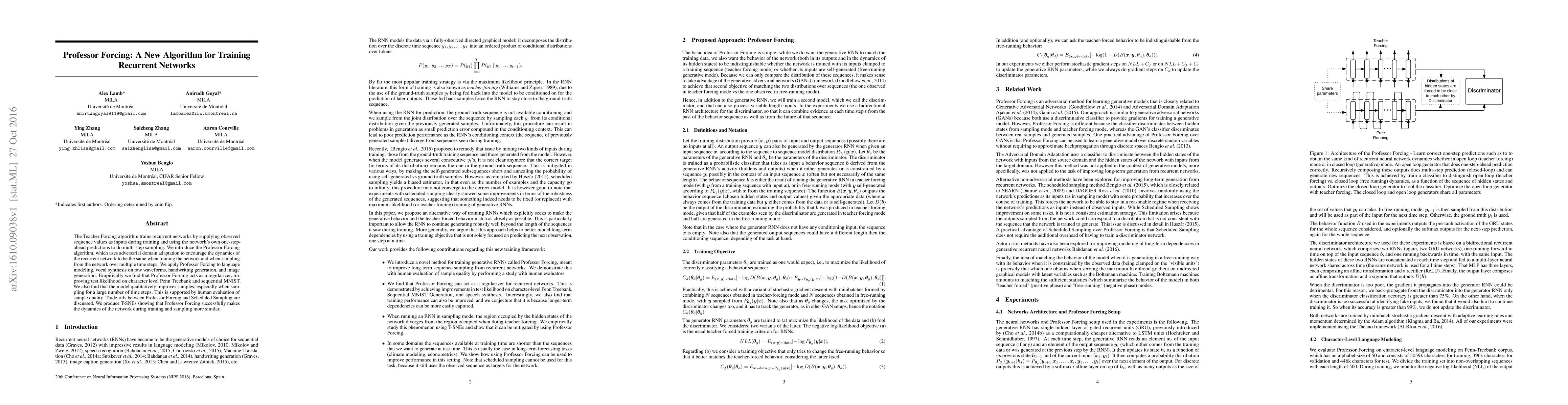 The Professor Forcing algorithm trains recurrent networks by aligning training and sampling dynamics through adversarial domain adaptation, improving test likelihood and sample quality in various tasks. It acts as a regularizer, outperforming Teacher Forcing in empirical and human evaluations.