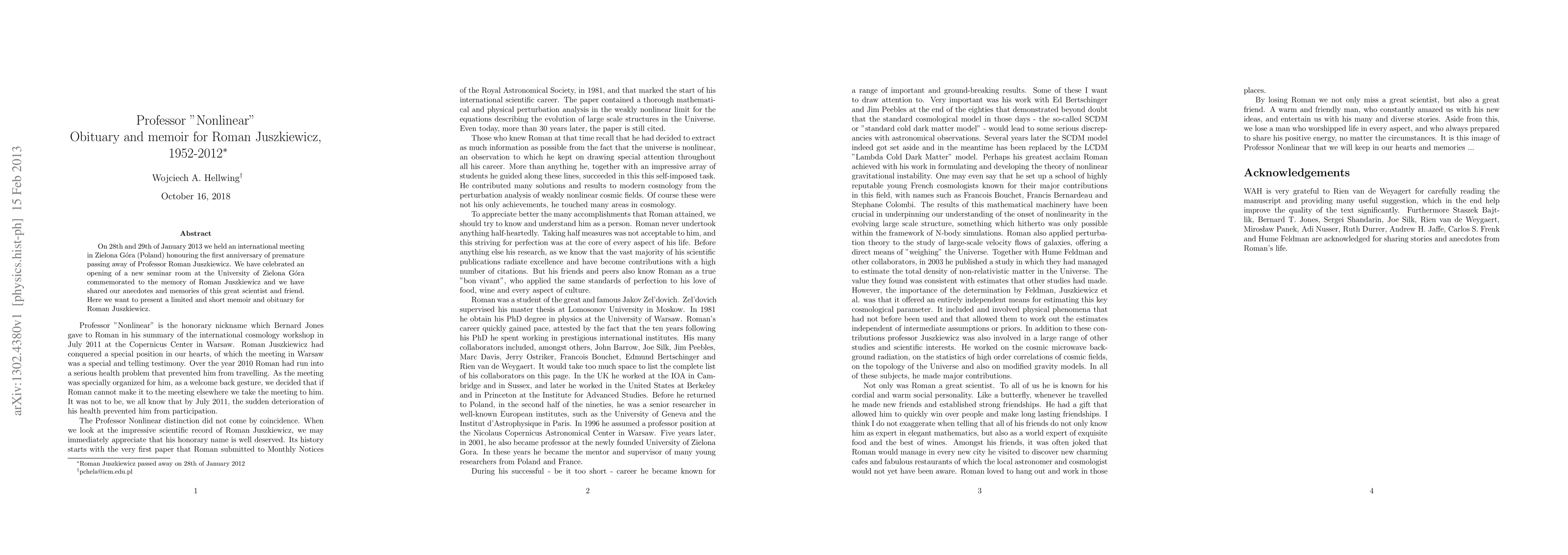 On 28th and 29th of January 2013 we held an international meeting in Zielona G\'ora (Poland) honouring the first anniversary of premature passing away^(1) of Professor Roman Juszkiewicz. We have celebrated an opening of a new seminar room at the University of Zielona G\'ora commemorated to the memory of Roman Juszkiewicz and we have shared our anecdotes and memories of this great scientist and friend. Here we want to present a limited and short memoir and obituary for Roman Juszkiewicz. 1: Roman Juszkiewicz passed away on 28th of January 2012