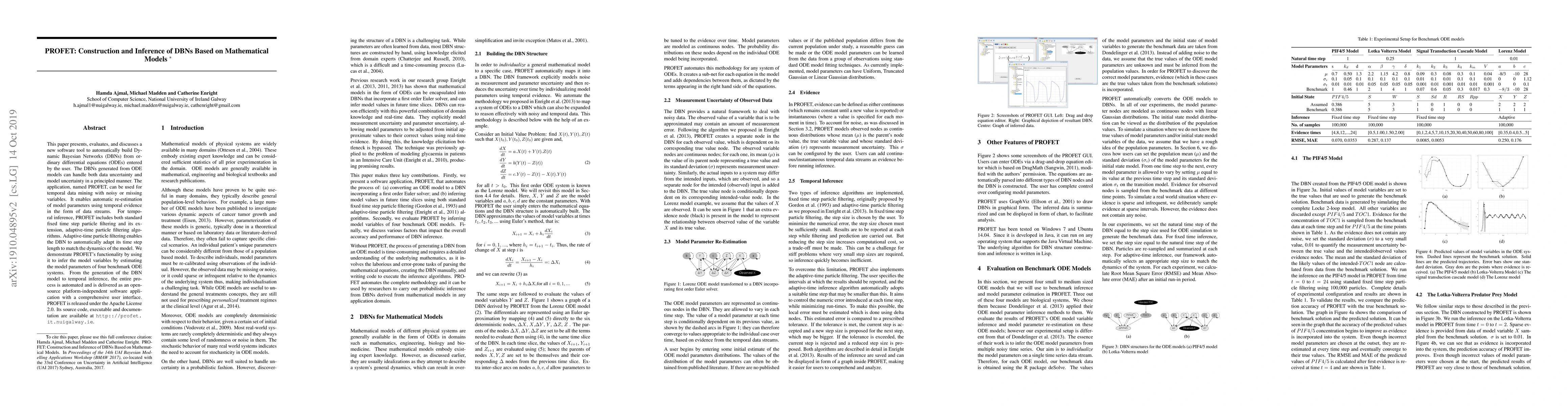 This paper presents, evaluates, and discusses a new software tool to automatically build Dynamic Bayesian Networks (DBNs) from ordinary differential equations (ODEs) entered by the user. The DBNs generated from ODE models can handle both data uncertainty and model uncertainty in a principled manner. The application, named PROFET, can be used for temporal data mining with noisy or missing variables. It enables automatic re-estimation of model parameters using temporal evidence in the form of data streams. For temporal inference, PROFET includes both standard fixed time step particle filtering and its extension, adaptive-time particle filtering algorithms. Adaptive-time particle filtering enables the DBN to automatically adapt its time step length to match the dynamics of the model. We demonstrate PROFET's functionality by using it to infer the model variables by estimating the model parameters of four benchmark ODE systems. From the generation of the DBN model to temporal inference, the entire process is automated and is delivered as an open-source platform-independent software application with a comprehensive user interface. PROFET is released under the Apache License 2.0. Its source code, executable and documentation are available at http:://profet.it.nuigalway.ie.